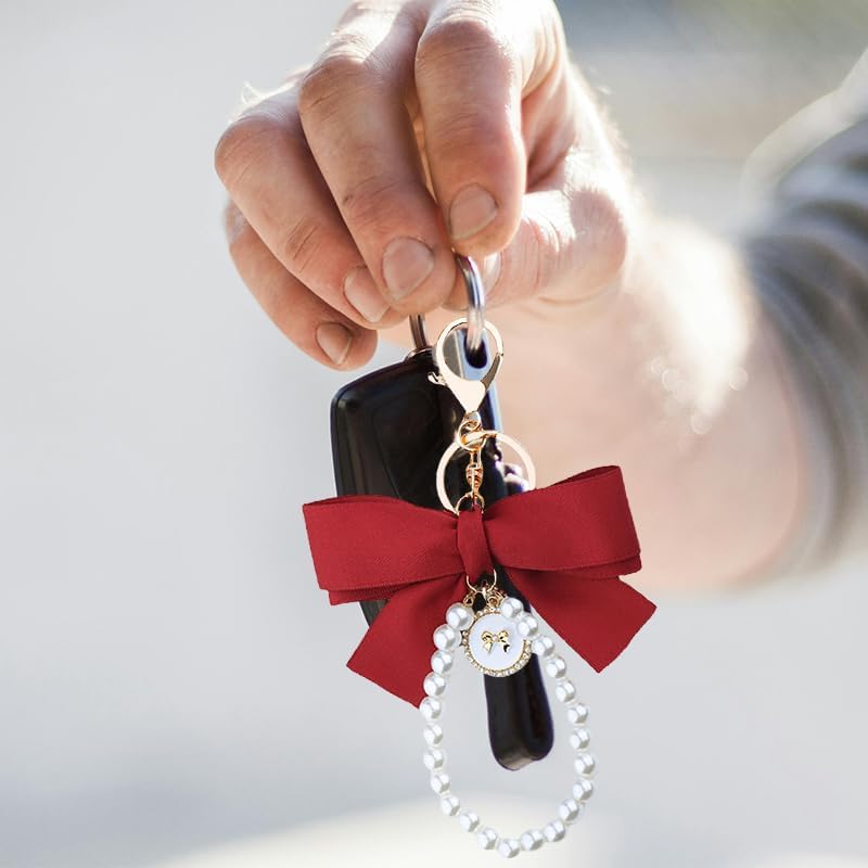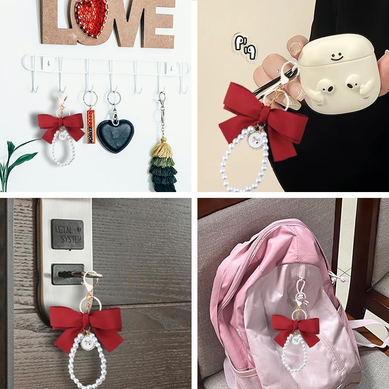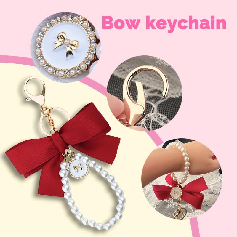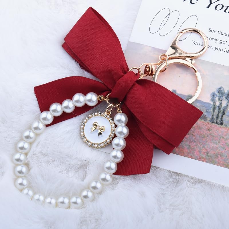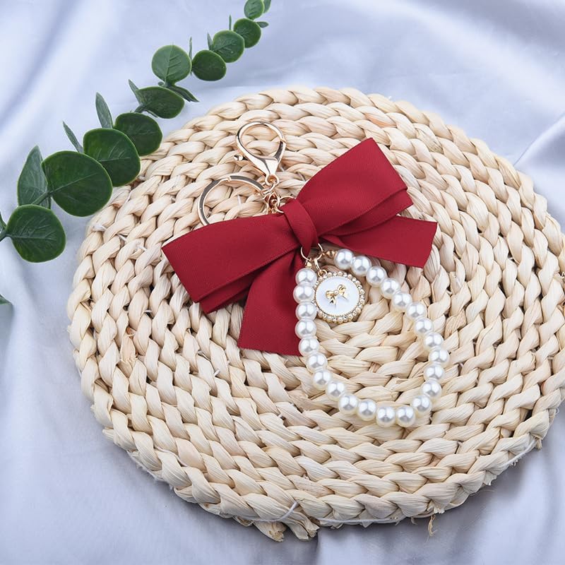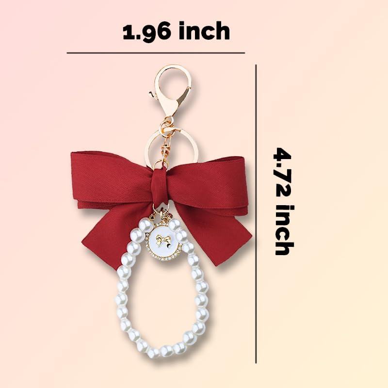 The combination of pearls and a ribbon bowknot adds a touch of elegance and fun to any accessory collection, perfect as red bow wristlet keychain for women, bag charm chain for handbags as a perfect fashion statement for any outfit