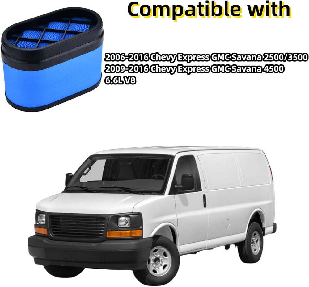 15102546, 20815924, 49154, 5000235672, 83154, 9154, A2959, A2959C, A3140C, A55696, A5696, AF10491, AF2403, AF26494, AF5696, CA10491, CA5370, LAF2959, MA2959, P547386, P611720, PA5696, PAB10491, PAF5696; Compatible with 2006 - 2016 Chevy Express 2500 6.6L V8, 2006 - 2016 Chevy Express 3500 6.6L V8, 2009 - 2016 Chevy Express 4500 6.6L V8; 2006 - 2016 GMC Savana 2500 6.6L V8, 2006 - 2016 GMC Savana 3500 6.6L V8, 2009 - 2016 GMC Savana 4500 6.6L V8.