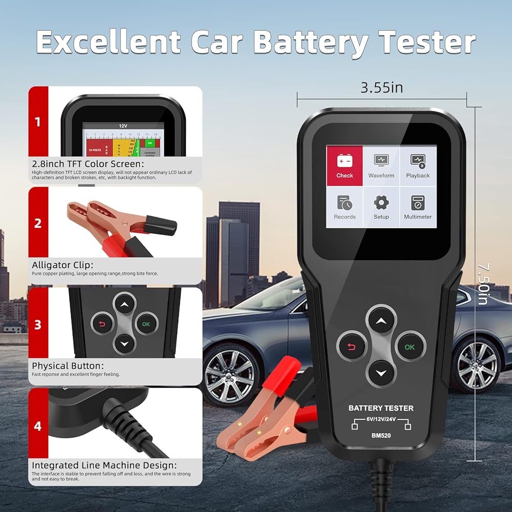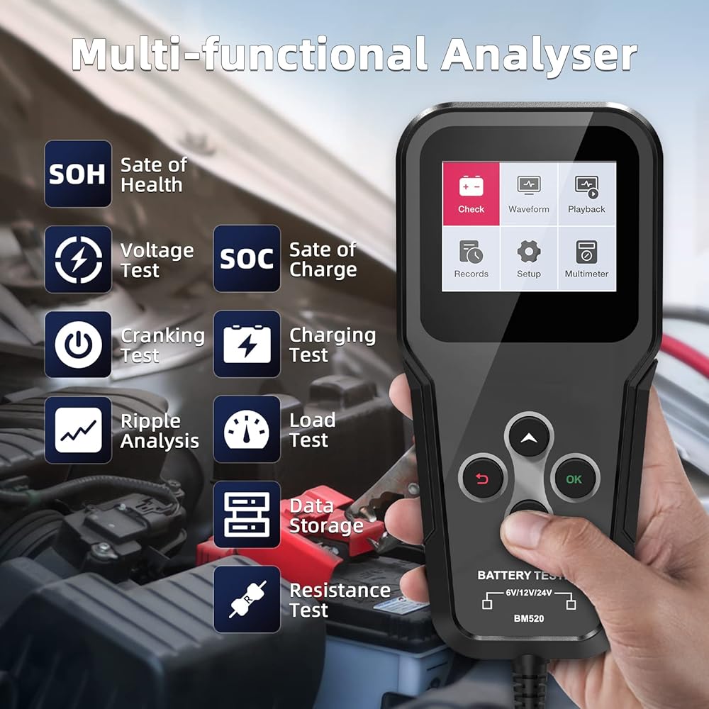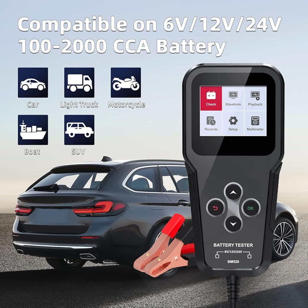 جهاز اختبار بطارية السيارة BM520 6V 12V 24V، جهاز اختبار حمل 100-2000 CCA، جهاز اختبار مولد كهربائي للسيارات، جهاز تحليل بطارية 2-220 أمبير في الساعة، محلل بطارية السيارة الرقمي، جهاز اختبار نظام التدوير للشاحنة والدراجات النارية وقارب الدفع الرباعي