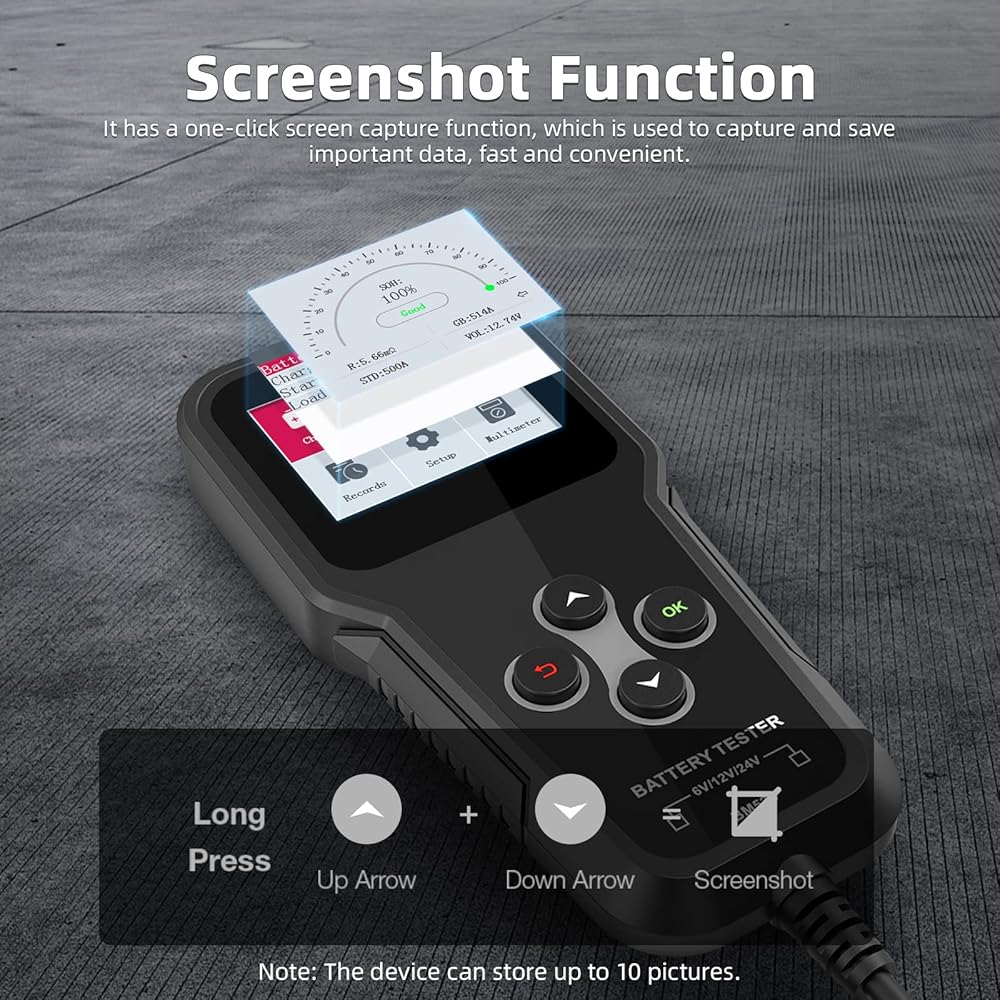 محلل البطارية الرقمي: يمكن لمحلل بطارية السيارة BM520 عرض بيانات متعددة لبطارية السيارة بسرعة ودقة. دعم اختبار صحة البطارية، واختبار التحريك، واختبار الشحن، واختبار التحميل واختبار البدء. بمساعدة جهاز اختبار البطارية الخاص بنا، يمكنك بسهولة فهم الحالة الحالية لبطارية سيارتك وتجنب الحوادث في وقت مبكر. ويمكنه أيضًا التقاط لقطة شاشة عند الضغط لفترة طويلة على زر السهم لأعلى ولأسفل في نفس الوقت لمدة 3 ثوانٍ، واستمر في التحقق من النتائج على الذهاب.