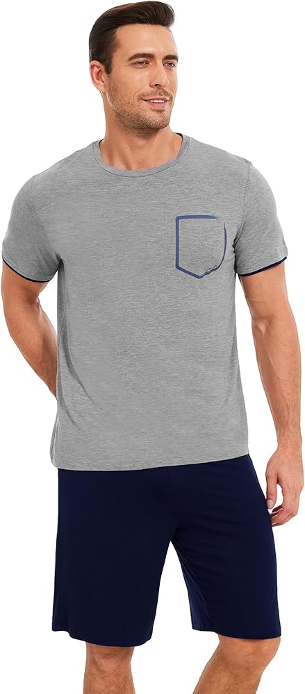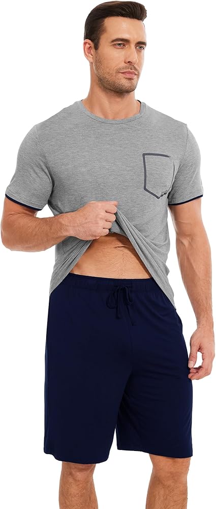 • طقم شورت بيجامة رجالي بسيط ومريح. بلوزة برقبة دائرية وأكمام قصيرة. الشورت: حزام خصر مطاطي برباط، وجيوب جانبية. الجيوب الجانبية كبيرة بما يكفي لحمل هاتفك