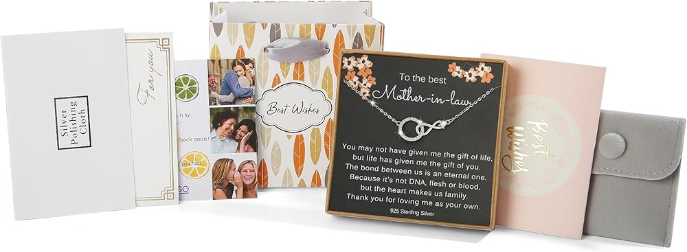 مجوهرات لأم الزوج: تشتمل على القلادة، وصندوق الهدايا، وقطعة قماش لتلميع الفضة، وبطاقة تهنئة فارغة، وحقيبة هدايا، ومظروف، وحقيبة ناعمة. يتم تعليق القلادة بشكل صحيح على بطاقة الاقتباس. خذ دقيقة من وقتك لإنهاء بطاقة الرسالة وتجميع كل شيء لجعل هذه الهدية ذات معنى أكبر.