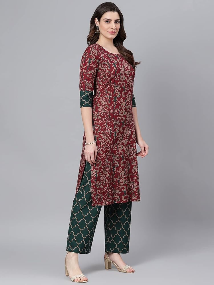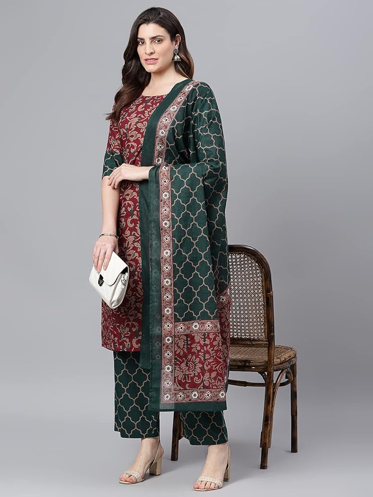 مجموعة كورتا نسائية رائعة مع الوشاح - ارفع أناقتك مع هذه الكورتا المطبوعة باللون العنابي، وبنطلون بالازو المطبوع باللون الأخضر الداكن، والوشاح، مما يجعلها مجموعة كورتا رائعة مع الوشاح للمناسبات الاحتفالية والحفلات.