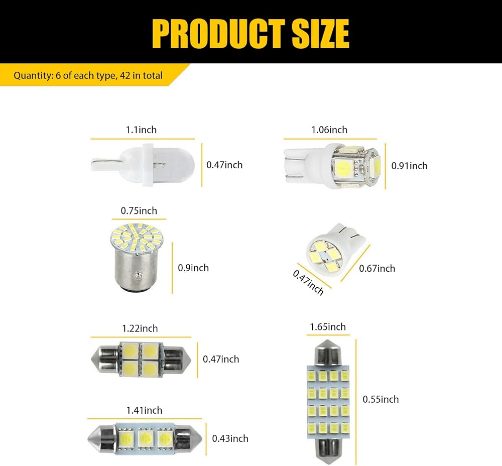 What You Will Get: The package comes with 42 pieces of LED dome lights interior car lights in 7 models, they are respectively is 6 x 31mm 4smd LEDs, 6 x 36mm 3smd LEDs, 6 x 41mm 16smd LEDs, 6 x T10 5smd LEDs, 6 x T10 0.2W map LEDs, 6 x T10 4-SMD LEDs, 6 x 1156 22smd cornering and brake LEDs.