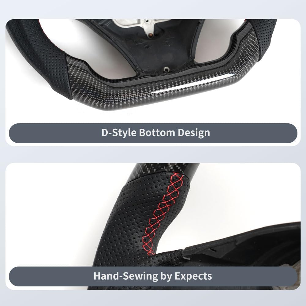 • تصميم فريد: توجد علامة حمراء في منتصف عجلة القيادة لضمان سلامة القيادة. المقابض على كلا الجانبين مصنوعة من جلد مثقوب، وهو ماص للعرق وجيد التهوية، مما يمنحك تجربة قيادة أفضل. تمت خياطة الخيط الأحمر يدويًا على يد خبراء، مما يضيف أسلوبًا فريدًا إلى داخل السيارة. يوفر التصميم المسطح على شكل حرف D مساحة أكبر للأرجل، ويحسن راحة القيادة