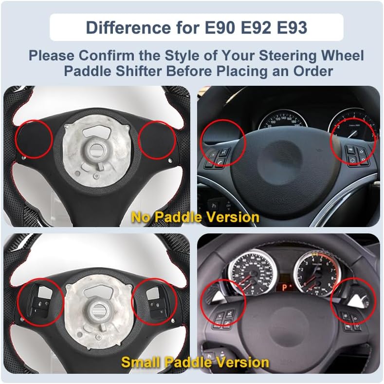 • الإعداد: عجلة القيادة هذه من ألياف الكربون مناسبة لسيارات BMW M3 E90 E92 E93 2005-2012 (إصدار فتحات نقل الحركة الكبيرة). يرجى التحقق من موضع فتحات مجداف عجلة القيادة في سيارتك الأصلية قبل الشراء لضمان التثبيت السلس