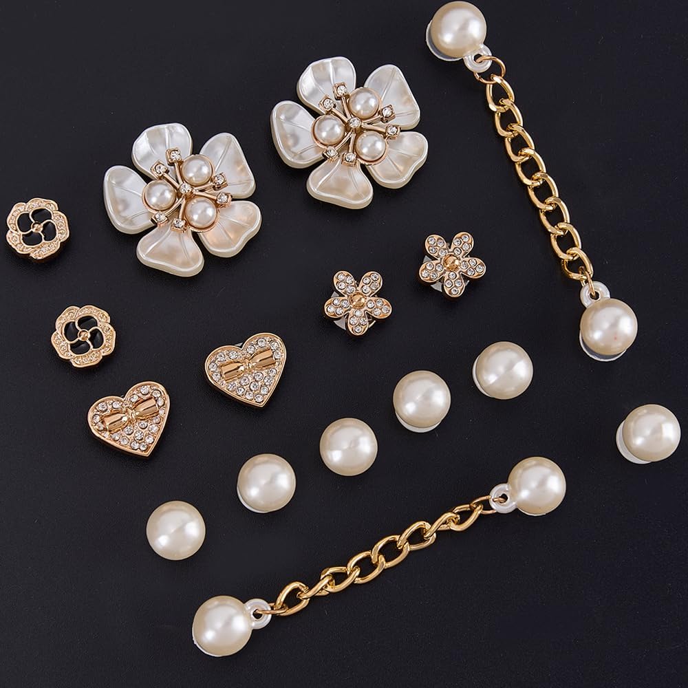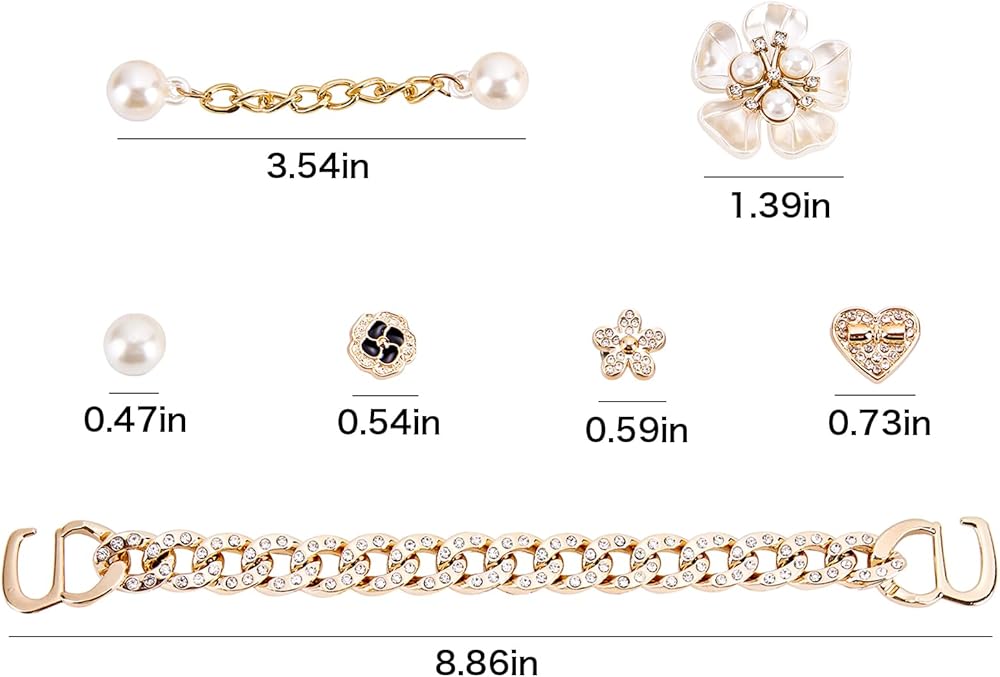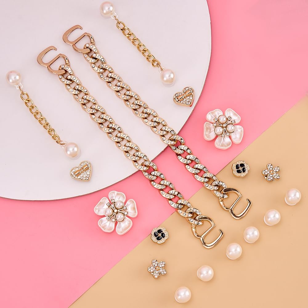 زينة الأحذية اللامعة: تحتوي هذه المجموعة على 18 قطعة من زينة الأحذية الذهبية الجميلة. عزز حذائك مع هذه الأحذية الساحرة المصنوعة بشكل جميل من الزهور وعلى شكل قلب، والتي تتميز بالكريستال المتلألئ واللؤلؤ لإضفاء لمسة من الأناقة.