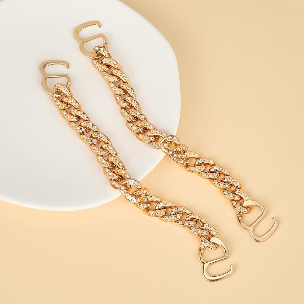 سلاسل الأحذية الذهبية اللامعة: تتضمن المجموعة سلسلتين رائعتين للأحذية يمكن دمجهما مع حلي الأحذية الأخرى لتعزيز أناقة وجمال حذائك. يمكن أيضًا استخدام هذه السلاسل بمفردها لإضافة لمسة أنيقة وعصرية. كل رابط من سلسلة الحذاء قابل للفصل، مما يسمح لك بتعديله حسب مقاسك المثالي.
