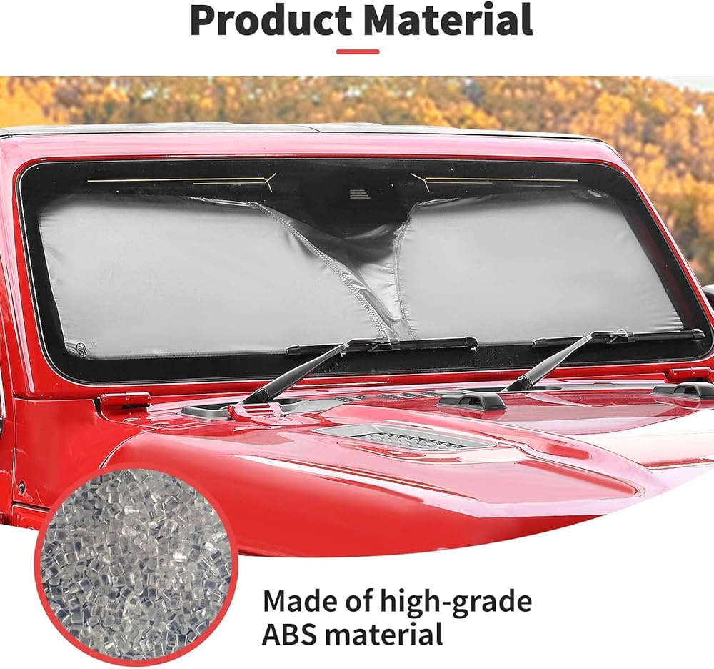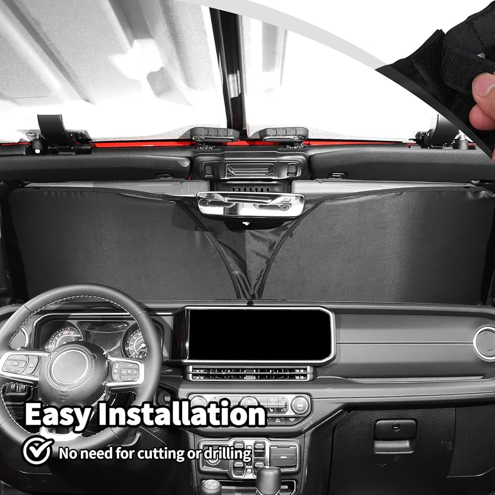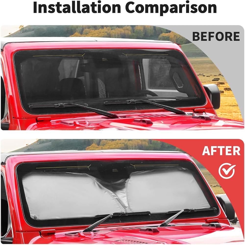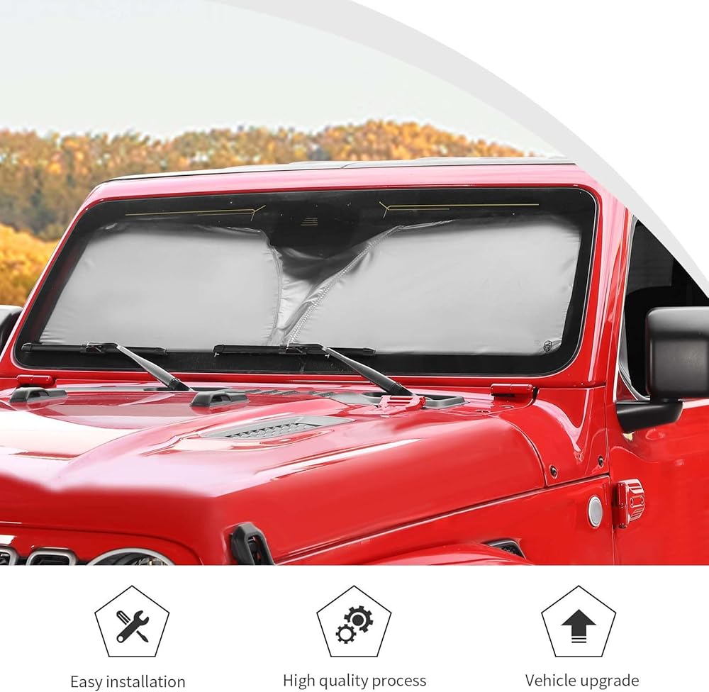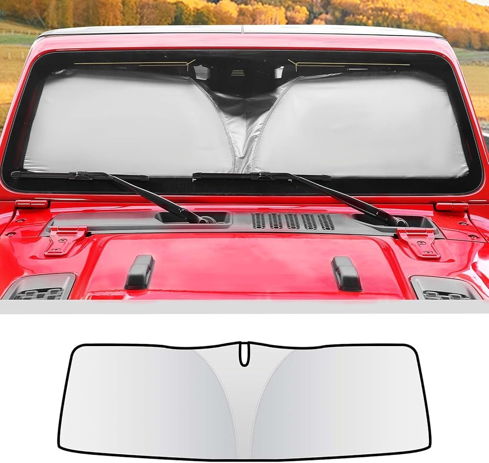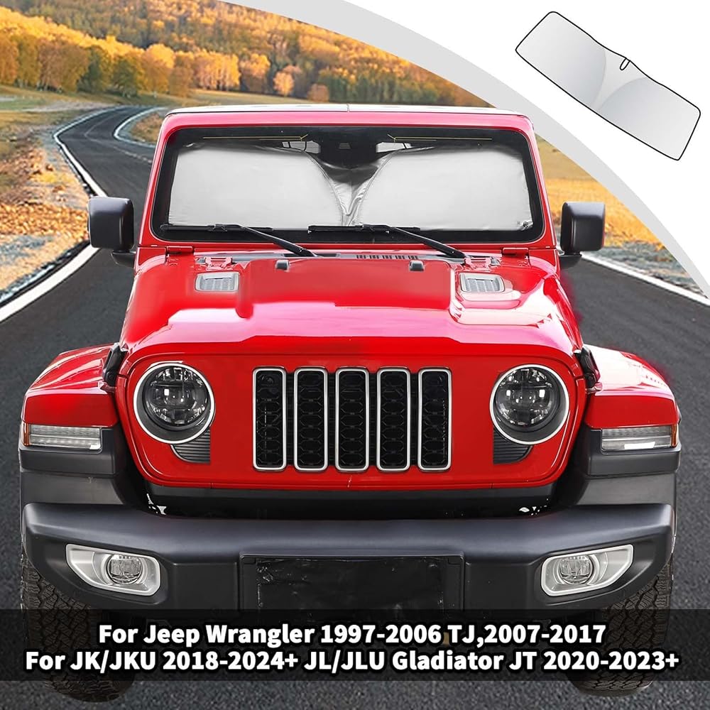 • ملاءمة مخصصة: حاجب الشمس للزجاج الأمامي، نافذة الشمس، درع الحرارة، حاجب الشمس للأشعة فوق البنفسجية وكتل درع الشمس قابلة للطي لـ 1997-2024 Jeep Wrangler TJ JK JKU JL JLU Gladiator JT الملحقات الخارجية (الرياضة، الصحراء، الحرية والروبيكون)
