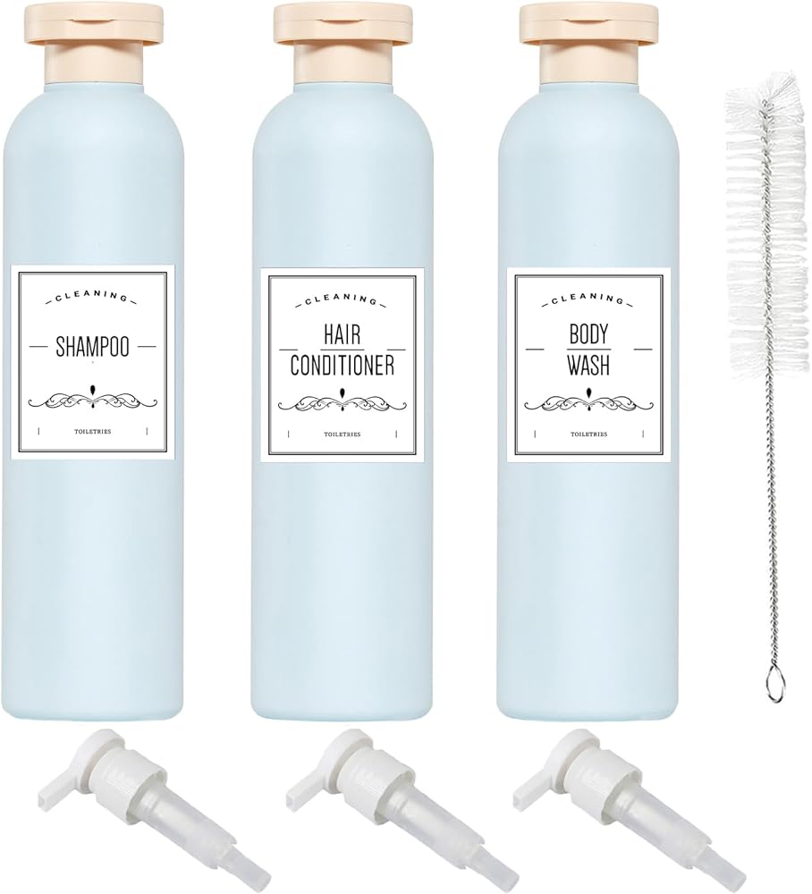 تتضمن العبوة: 3 قطع من زجاجات الشامبو الفارغة الخضراء سعة 8.8 أونصة/260 مل، و3 أغطية قابلة للطي و3 موزعات مضخات، و3 قطع من ملصقات أدوات الزينة، وفرشاة نظيفة واحدة
