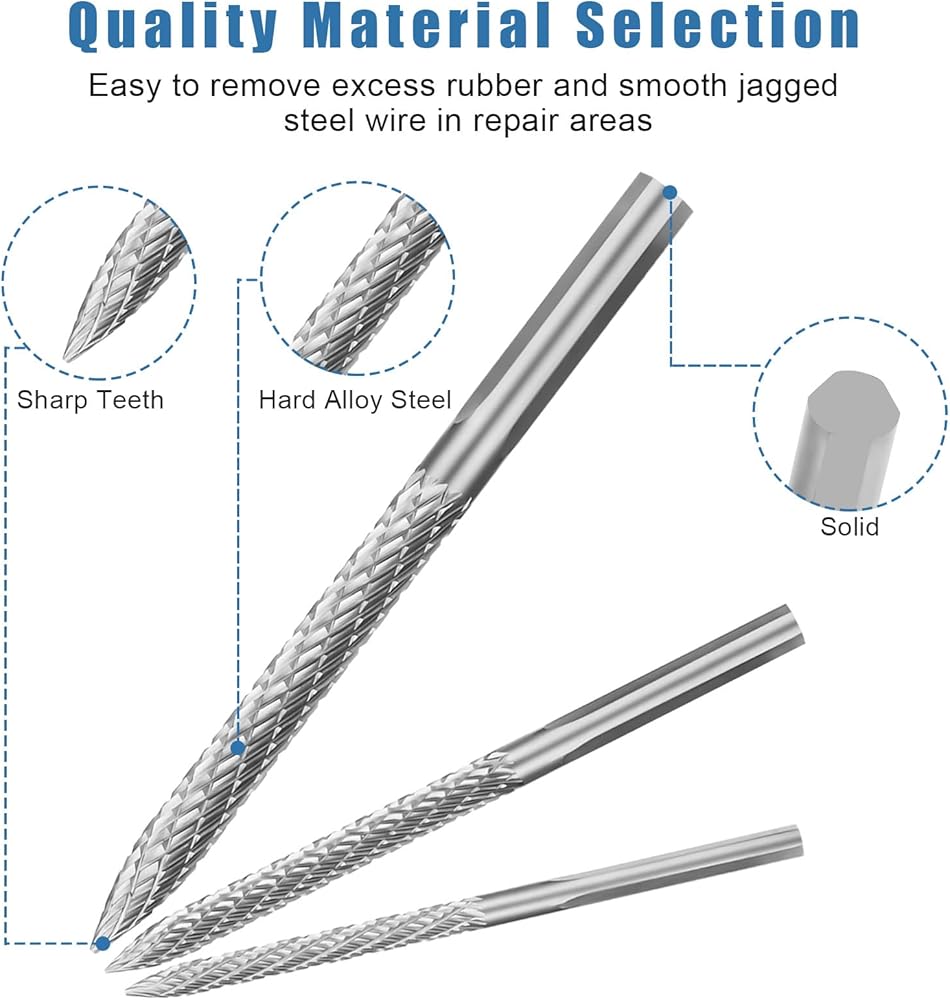 مواد عالية الجودة: قطع كربيد إصلاح الإطارات الخاصة بنا مصنوعة من سبائك الفولاذ الصلب. قوي بما فيه الكفاية ضد الكسر والصدأ والتآكل، مما يوفر لك قطعًا أسرع وعمر استخدام أطول
