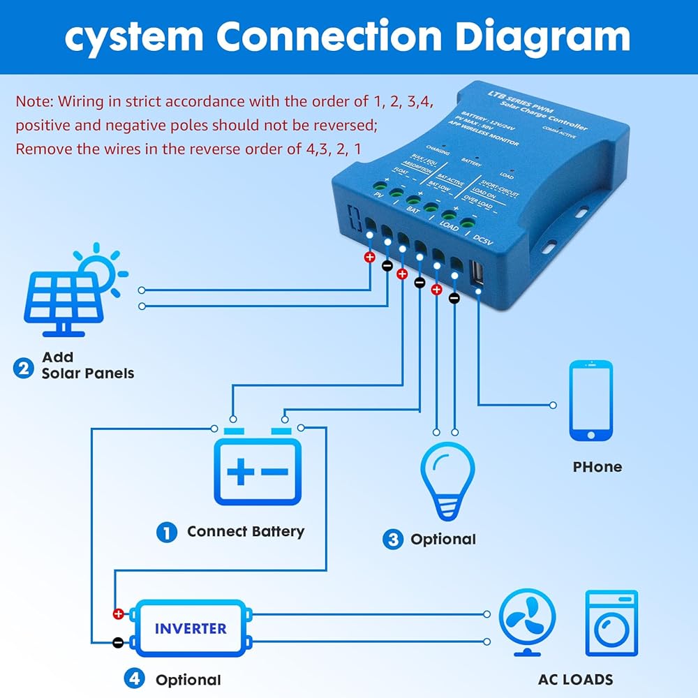 【التوصيل والتشغيل】وحدة التحكم بالشحن هذه هي 12 فولت/24 فولت تتكيف تلقائيًا وتدعم شحن الهاتف عبر USB. قم أولاً بتوصيل البطارية، ثم قم بتوصيل الألواح الشمسية. عند استخدامها لأول مرة، تأكد من أن البطارية بها جهد كافي، حتى تتمكن وحدة التحكم في الشحن PWM من التعرف على نوع البطارية الصحيح.