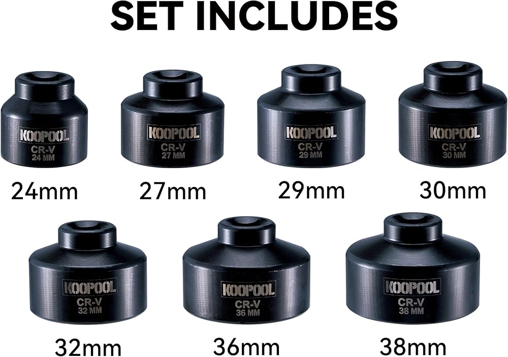 COMPLETE SET FOR VERSATILE COMPATIBILITY: This oil filter socket set includes 7 socket sizes (24mm, 27mm, 29mm, 30mm, 32mm, 36mm, 38mm), compatible with a wide range of foreign and domestic vehicles, including Mercedes-Benz, Cadillac, VW, Buick, BMW, Saturn, SAAB, Dodge, Ford, Mini Cooper, and Mack Trucks with specific oil filter caps.