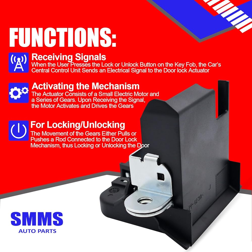 • ✔الوظائف - يتلقى مشغل قفل باب صندوق السيارة الخلفي SMMS إشارة كهربائية من وحدة التحكم المركزية في السيارة عندما يضغط المستخدم على زر القفل أو فتح القفل الموجود على سلسلة المفاتيح. تعمل هذه الإشارة على تنشيط محرك كهربائي صغير وتروس داخل المشغل، والذي يقوم بعد ذلك بتحريك قضيب لقفل الباب أو فتحه.