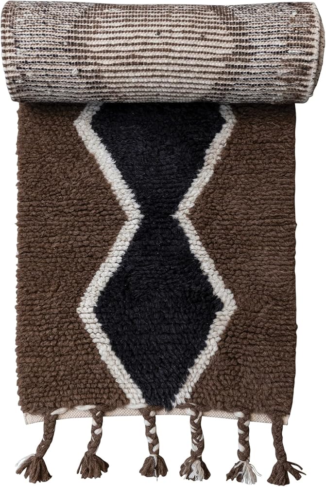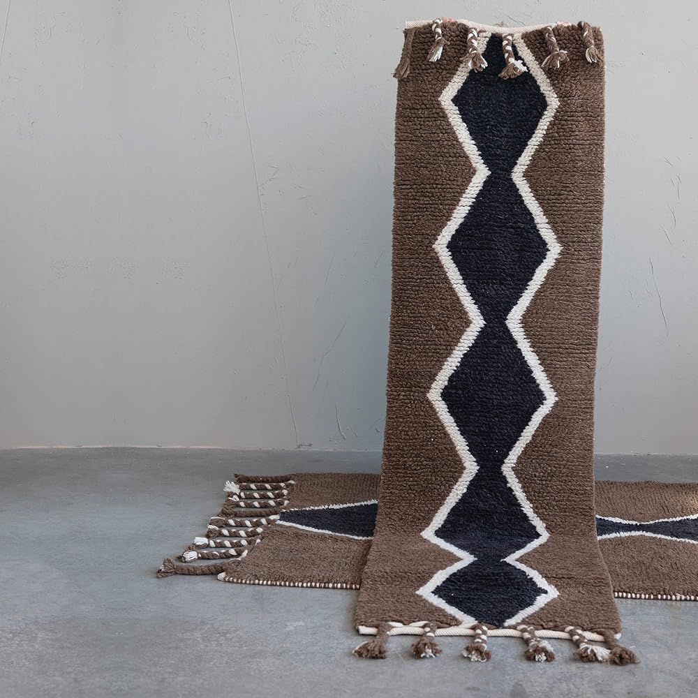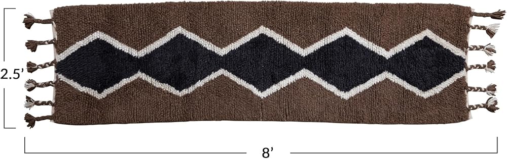 This Scandinavian-inspired runner rug showcases a masterfully handwoven cotton and wool adorned with a tufted diamond design and braided tassels