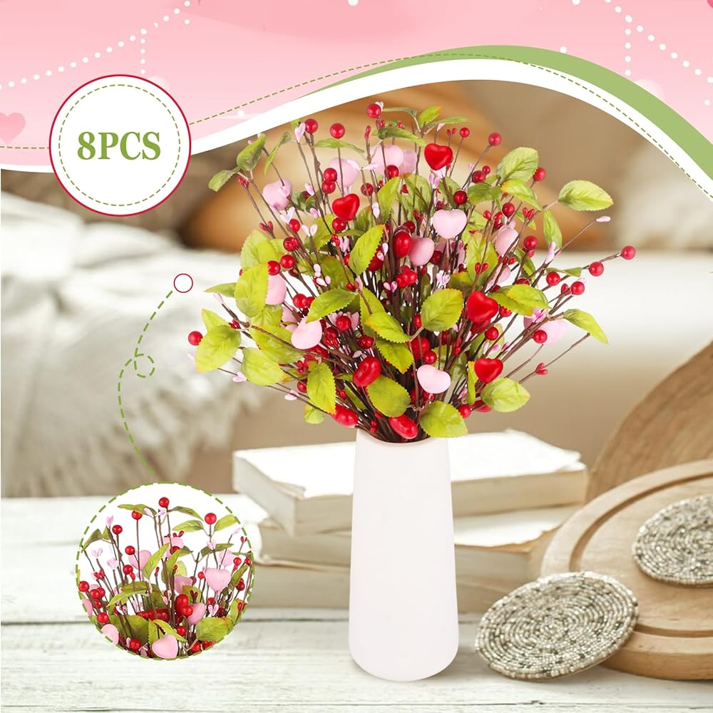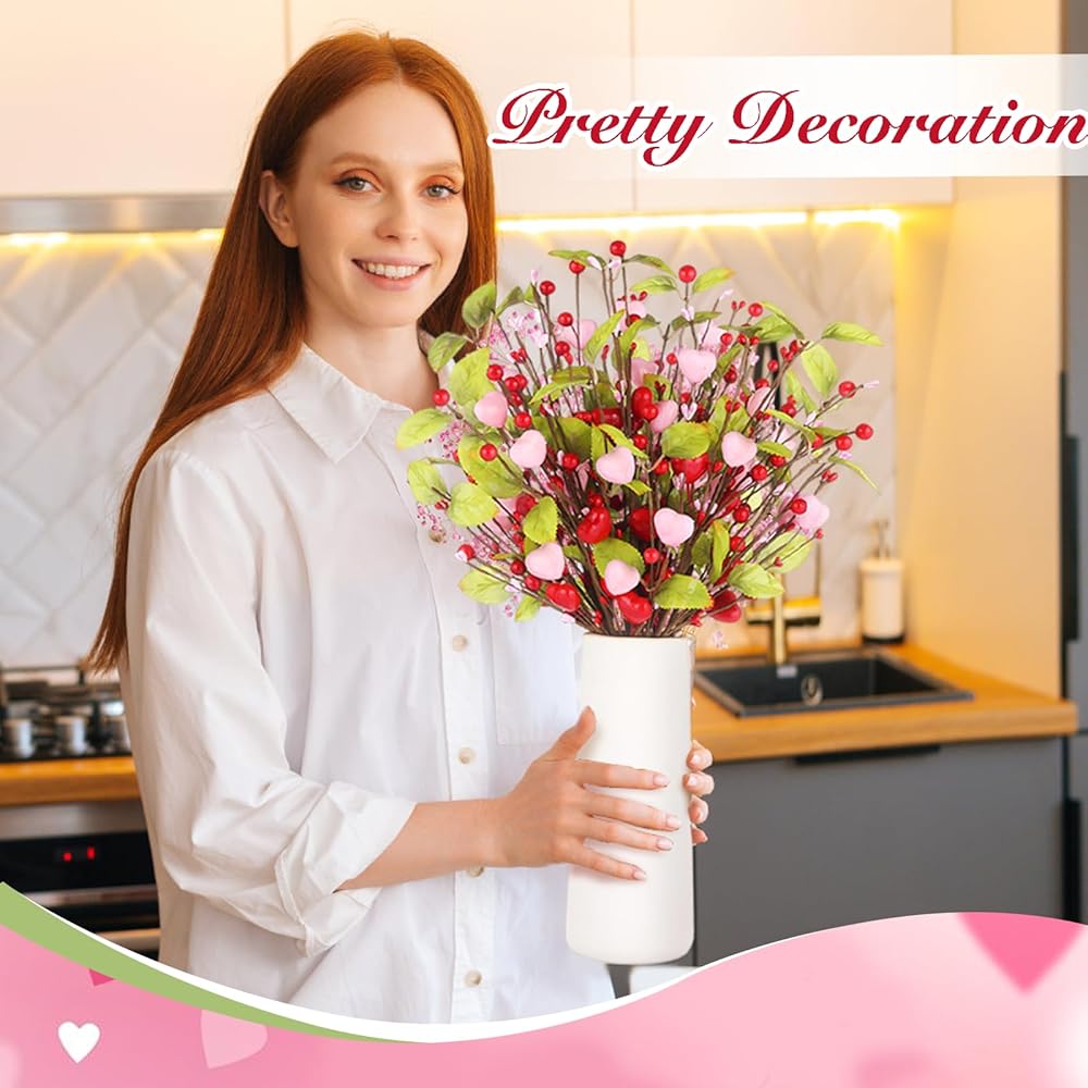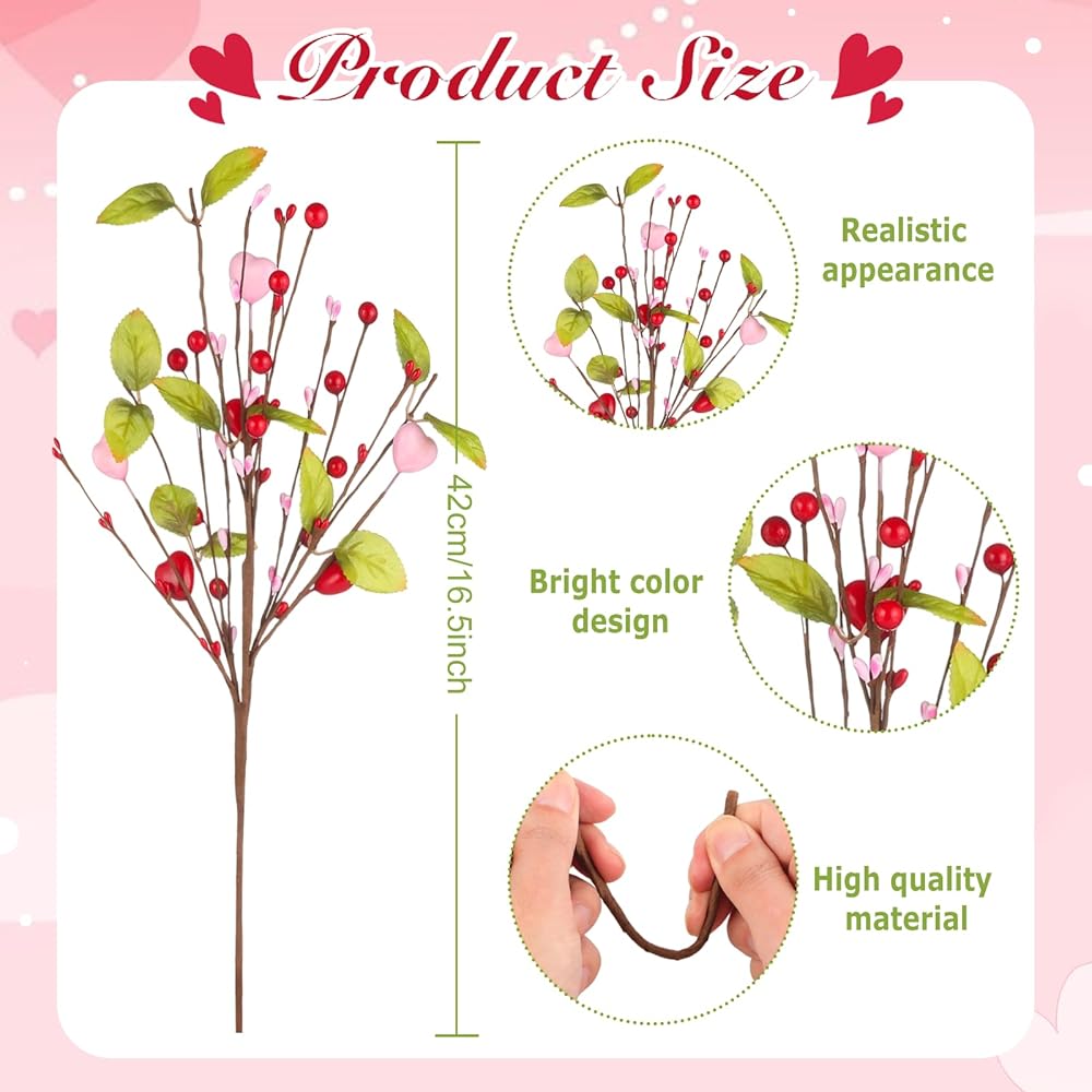 • Add a Romantic Valentine's Day Atmosphere: Add a warm and romantic Valentine's Day atmosphere to your home with our Valentine's Day decorations. Our 9-pack heart-shaped berry branches are designed with pink and red heart shapes, with vibrant green leaves, perfect for expressing love and holiday decorations.