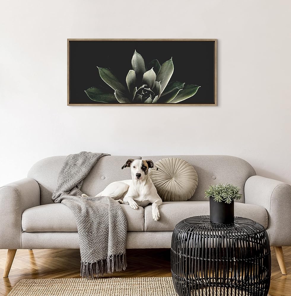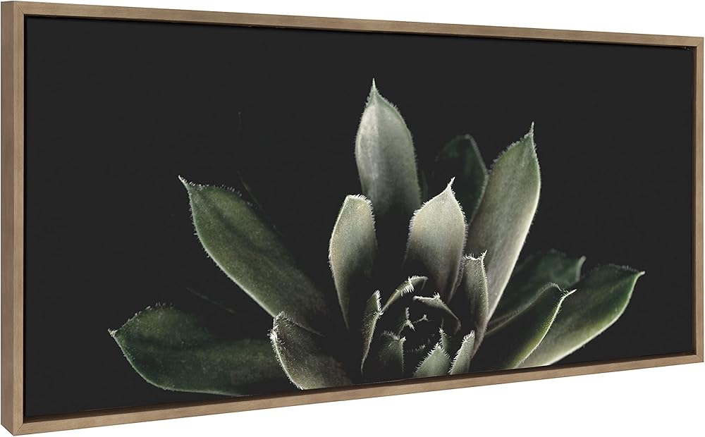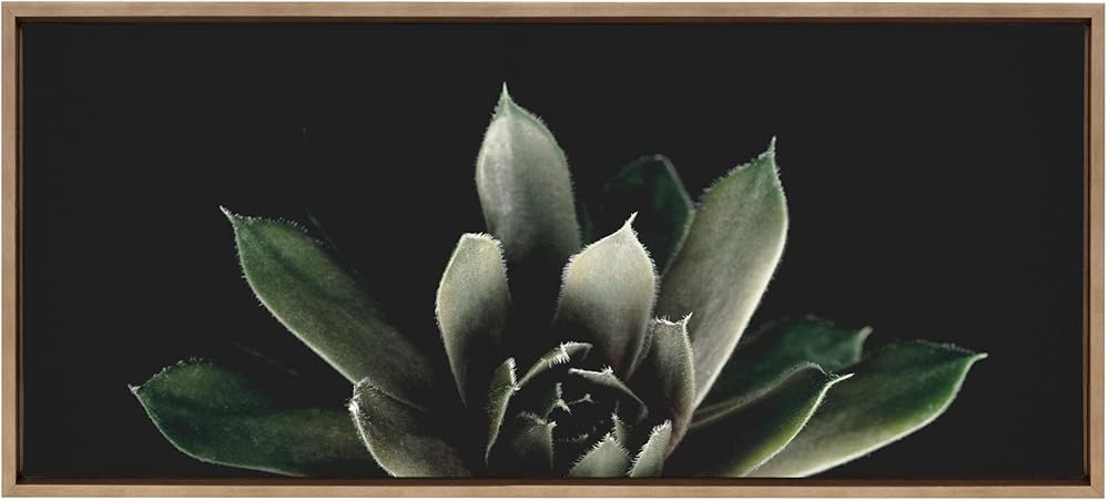 This decorative art print depicts a modern and sophisticated succulent to showcase in any room of your home. Framed in the USA in Waunakee, Wisconsin, this floating canvas art will be a pleasure to look at every day in your living room, bedroom, office, or any room in the home. This art print also makes an excellent gift for birthdays, holidays, or housewarming parties. Printed on gallery-wrapped canvas and framed with a lightweight polystyrene frame, this wall art has two hangers already attached to the MDF back for easy wall display. The outer dimensions are 40 inches by 18 inches by 1.62 inches. Print Name: “Succulent 8”