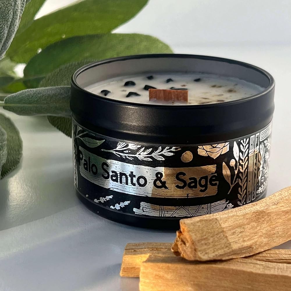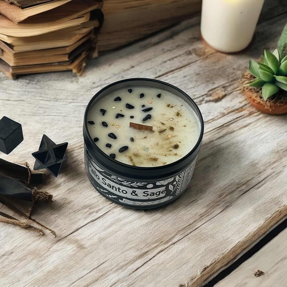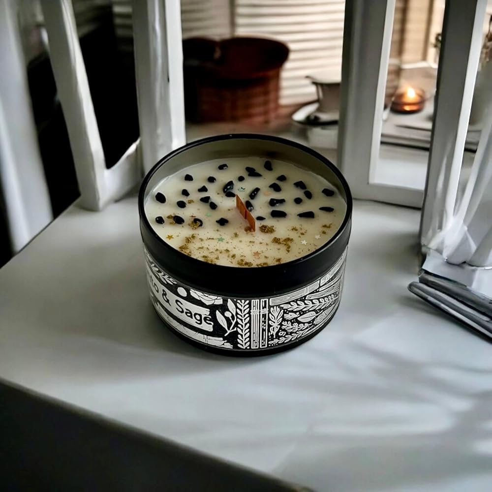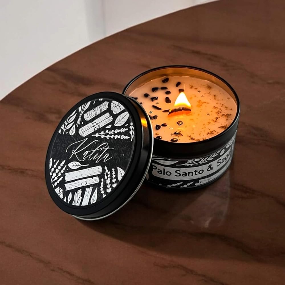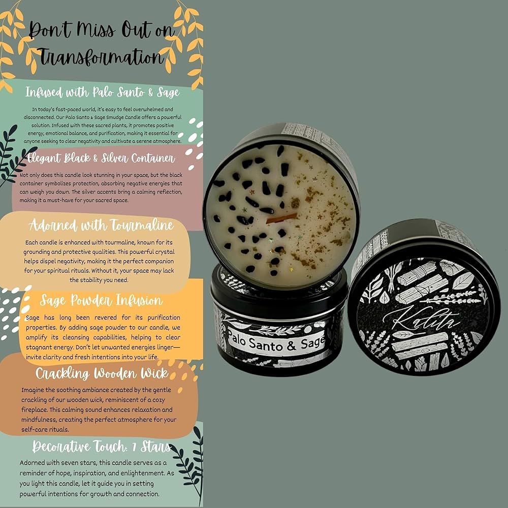 Looking to cleanse your space of negative energy and create a serene, peaceful environment? At Kalita, we've crafted the perfect candle to help you do just that. Our Kalita Palo Santo & Sage Smudge Soy Wax Candle is designed with your relaxation and spiritual healing in mind. Infused with natural Palo Santo and Sage, this candle offers a calming, aromatic experience that is gentle yet powerful — perfect for meditation, yoga, or simply unwinding after a long day. Each candle is hand-poured with love by our small, family-owned business, ensuring that every detail is carefully attended to. We believe that quality matters, which is why our candles are made with 100% soy wax, free from paraffin, phthalates, and harmful Prop. 65 ingredients. You deserve a clean, healthy burn, and that's exactly what we deliver. But our commitment doesn't stop there. We only source our ingredients locally here in the USA, supporting other small businesses and maintaining the highest standards. Every Kalita candle is a reflection of our dedication to providing you with a safe, non-toxic product that you can trust. And with the added tourmaline crystals and sage smudge, your candle not only fills the room with a beautiful scent but also amplifies your energy-cleansing rituals. Our customers rave about the long-lasting burn of our 6oz candles, designed to ensure every bit of wax is used, leaving no waste behind. You won't have to worry about uneven burns or tunneling—just consistent, aromatic bliss that lingers long after the candle is extinguished. At Kalita, we know the importance of supporting local and small businesses, and as a family-owned company, we pour our heart and soul into each and every candle. Whether you're looking to improve the energy in your home, enhance your spiritual practices, or simply enjoy a clean, relaxing aromatherapy experience, our Palo Santo & Sage Smudge Candle is made for you. Bring the cleansing power of natural Palo Santo, sage, and tourmaline crystals into your life. Elevate your space, cleanse negative energy, and enjoy a peaceful atmosphere with a candle that's as thoughtful and mindful as you are. Get it before it's gone! ADD TO CART