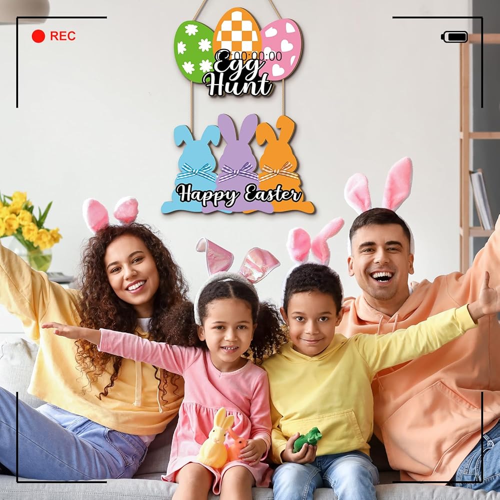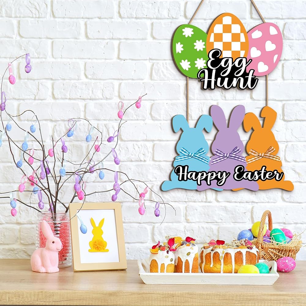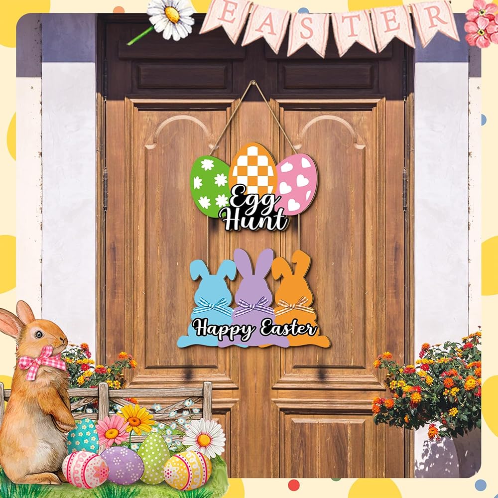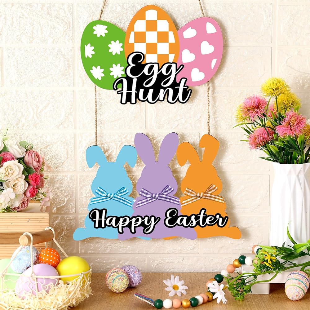 Easter Design: Easter wall decor composed with cute bunny and egg shape 2 parts in total, spliced with rope together, clearly printed with [Happy Easter] and [Egg Hunt], which is full of Easter elements, hanging this Easter sign on the door or wall to add an Easter festive atmosphere to your home