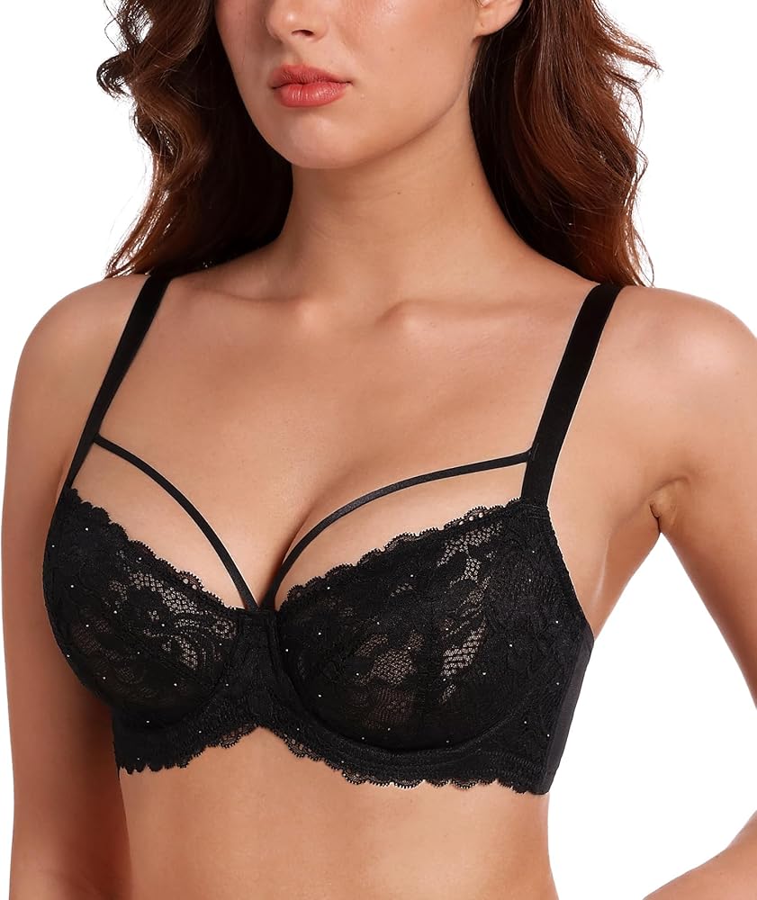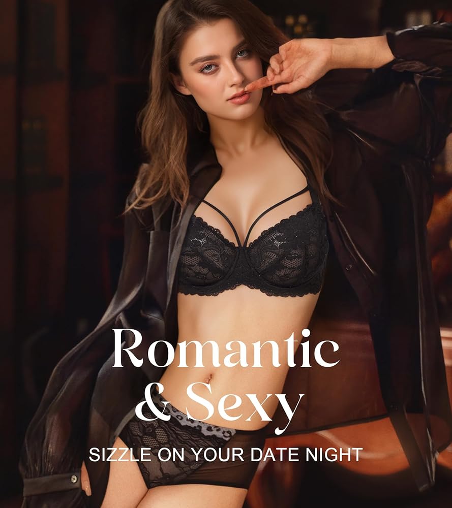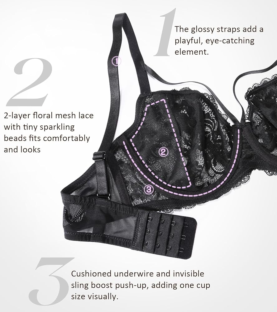 خامة مريحة: حمالة الصدر المثيرة مصنوعة من 94% بولي أميد، 6% سباندكس، مريحة ومسامية للارتداء اليومي. تم تصميم سطح الكوب بتصميم لامع وزهري أنيق، كما أن الدانتيل الرقيق يخلق مظهرًا أنيقًا وجميلاً.