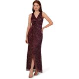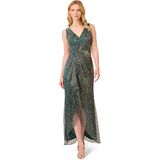 Turn on the sparkle at your next event in this metallic evening gown. This formal dress features a sleeveless surplice bodice, draped and ruffled details that fall from hip to hem, and a split skirt. Partially lined and crafted from metallic threaded mesh, this sleeveless gown has a sheer skirtthat shows off the legs at the front. A zipper back closure completes this ethereal look. Statement earrings and metallic heels are the perfect accessory to add further polish to this metallic dress.
