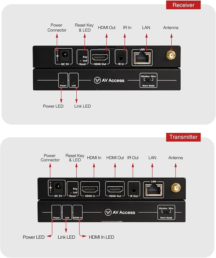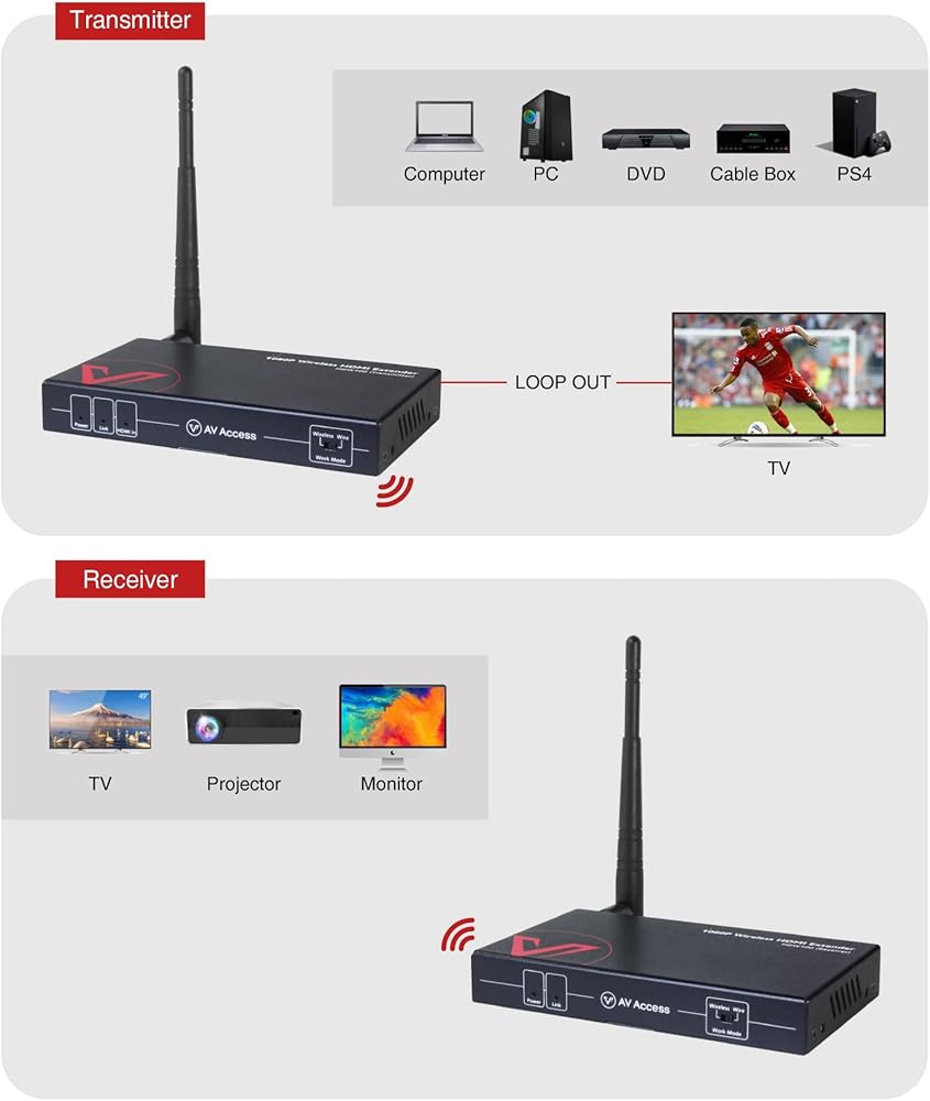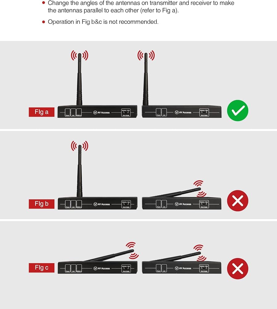 • 𝗟𝗲𝘀𝘀 𝗟𝗮𝘁𝗲𝗻𝗰𝘆, 𝗟𝗼𝗰𝗮𝗹 𝗟𝗼𝗼𝗽-𝗼𝘂𝘁 ✔ وقت التأخير بين جهاز الإرسال والاستقبال اللاسلكي أقل من 100 مللي ثانية (مقارنة بمعايير السوق الخاصة بـ 300 مللي ثانية). تتيح لك حلقة HDMI للعرض المحلي الاستمتاع بنفس العرض في غرف مختلفة. ممتاز للترفيه في الكنيسة والمنزل.