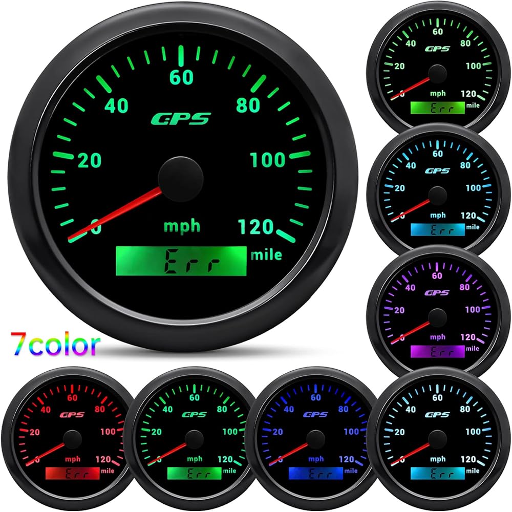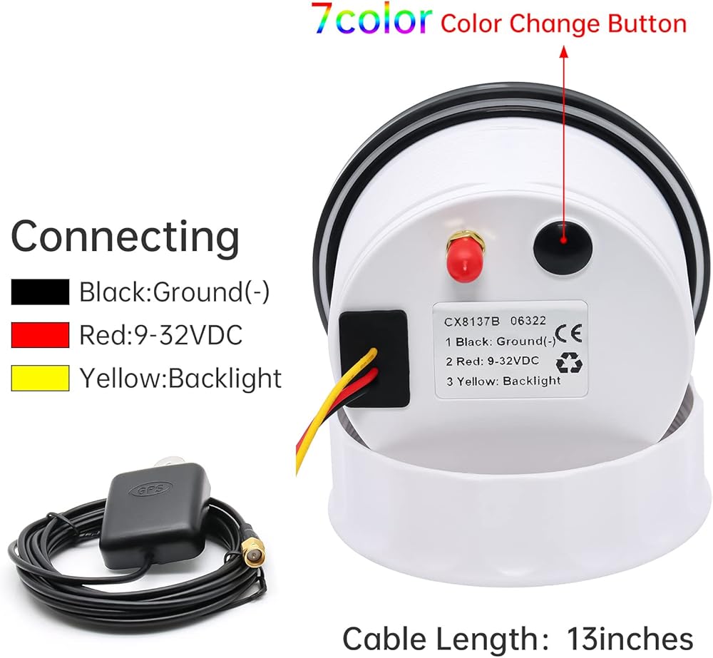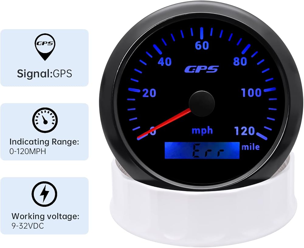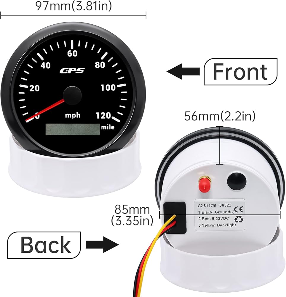 【الخامة: عداد السرعة GPS مصنوع من الفولاذ المقاوم للصدأ 316L وزجاج مضاد للضباب. درجة IP67 مقاومة للماء والغبار. يتم تثبيت عداد السرعة GPS للقارب لـ 85 مم (3 3/8 بوصة). نطاق الإشارة: 0-120 ميل في الساعة