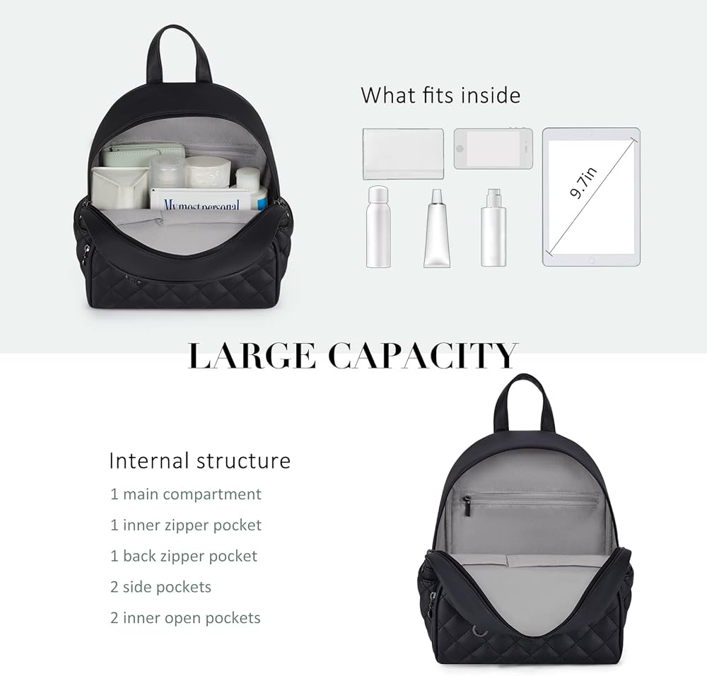 سعة كبيرة: تحتوي حقيبة الظهر الصغيرة للسفر هذه على حجرة رئيسية واحدة للكمبيوتر اللوحي مقاس 9.7 بوصة، والمحفظة، وجواز السفر، والمفاتيح، ومستحضرات التجميل، وغيرها من الأشياء الصغيرة؛ وجيبان جانبيان للأغراض الصغيرة الإضافية (غير مناسبة للمظلات). جيوب متعددة الوظائف تحافظ على مقتنياتك منظمة.