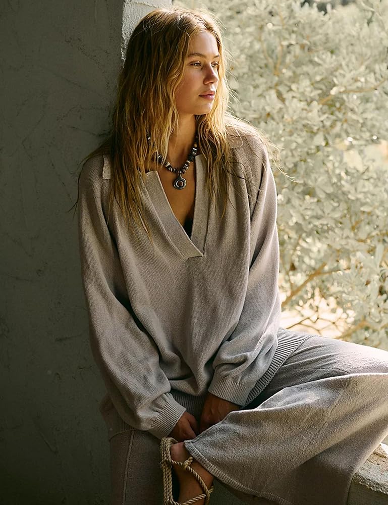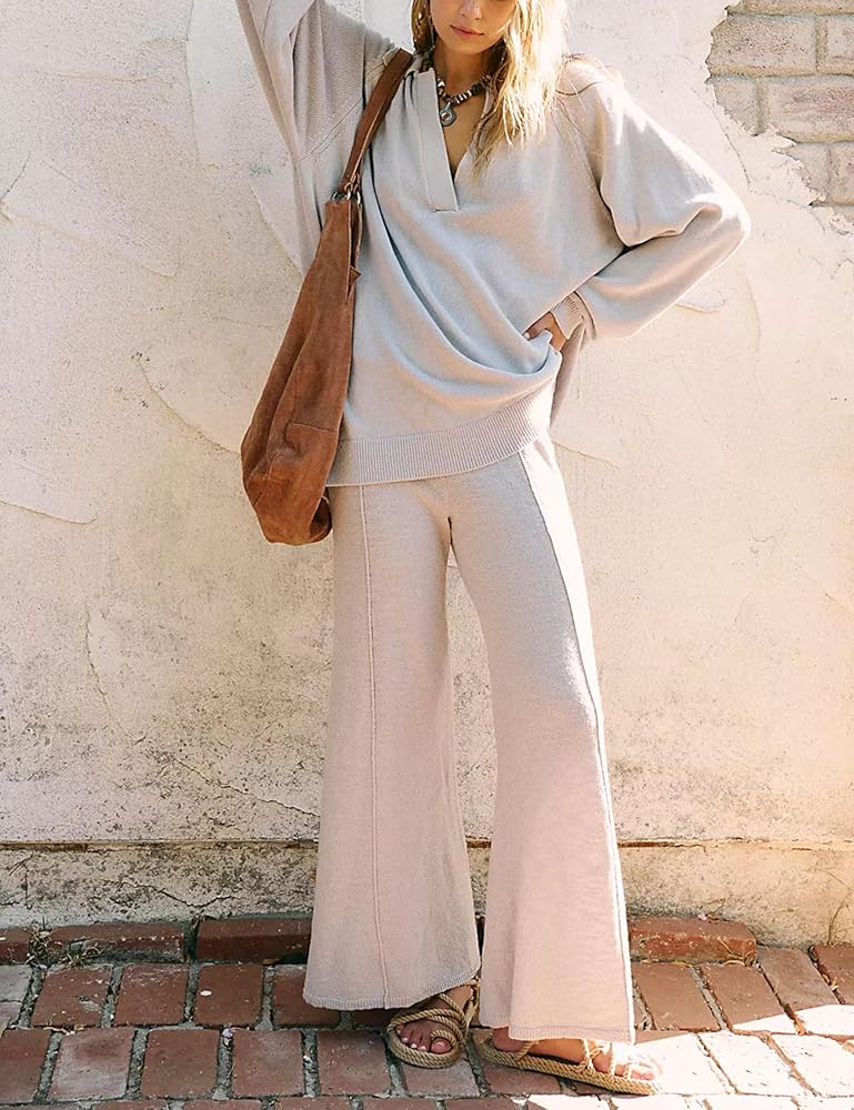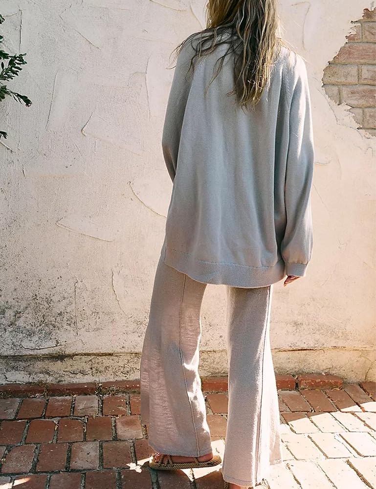 مجموعة ملابس نسائية كبيرة الحجم مكونة من قطعتين سترة فضفاضة غير رسمية برقبة على شكل حرف V وسراويل واسعة الساق ملابس مريحة (رمادي-L)