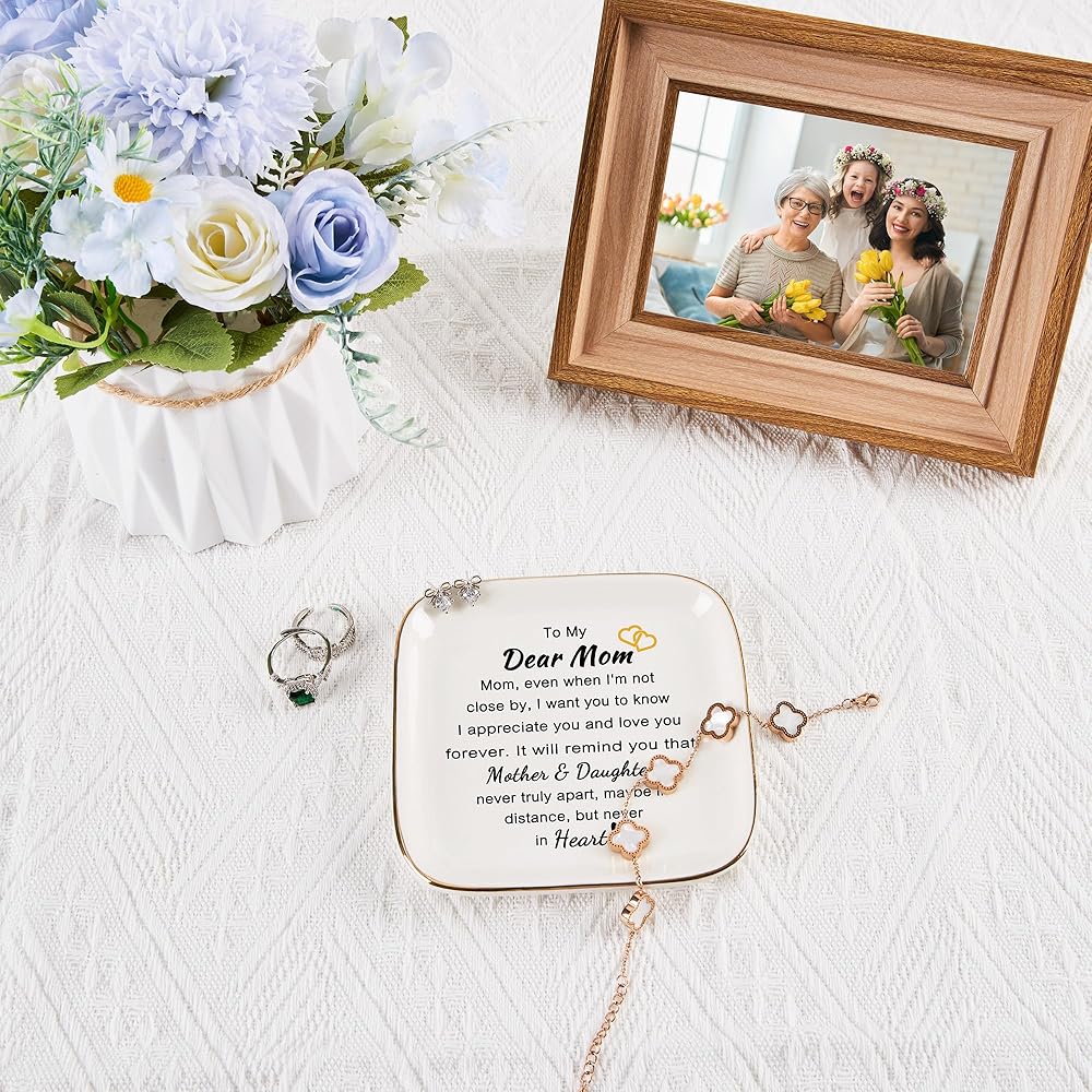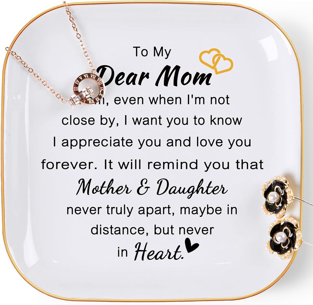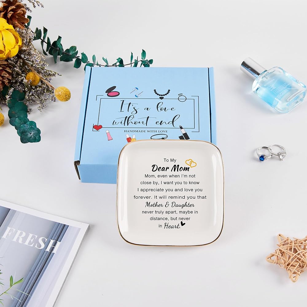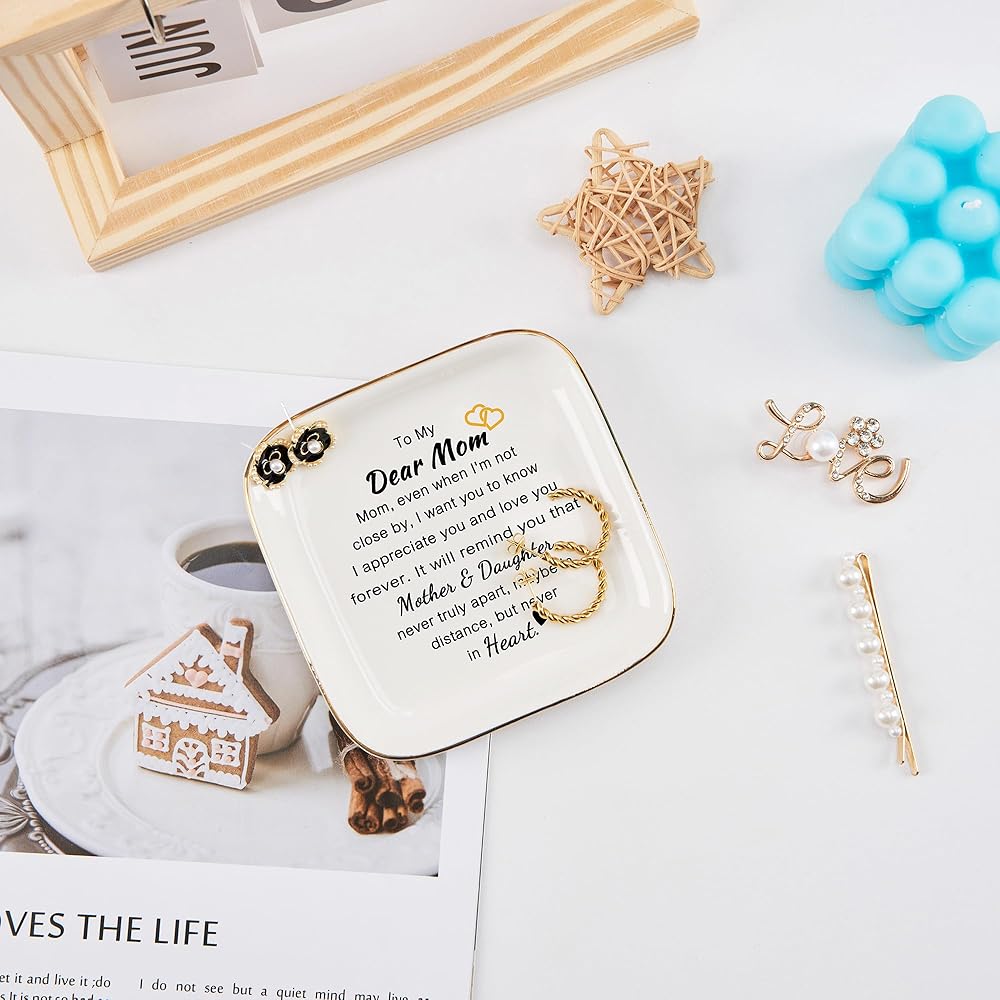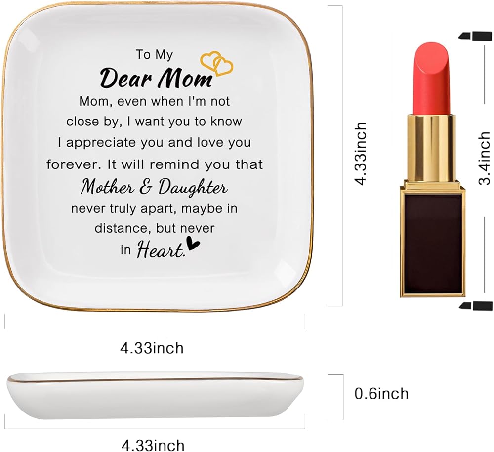 الحجم والمواد: حجم رائع 4.33 بوصة طول × 4.33 بوصة عرض × 0.6 بوصة ارتفاع، طبق حلية أنيق وأنيق لصديقك يحافظ على تنظيم المجوهرات اليومية لأصدقائك. مصنوع من السيراميك المصقول عالي الجودة مع زخرفة ذهبية، بسيط ولكنه أنيق. النص والنمط متينان جدًا، ولن يبلى حتى بعد الاستخدام طويل الأمد (الحلي غير متضمنة).