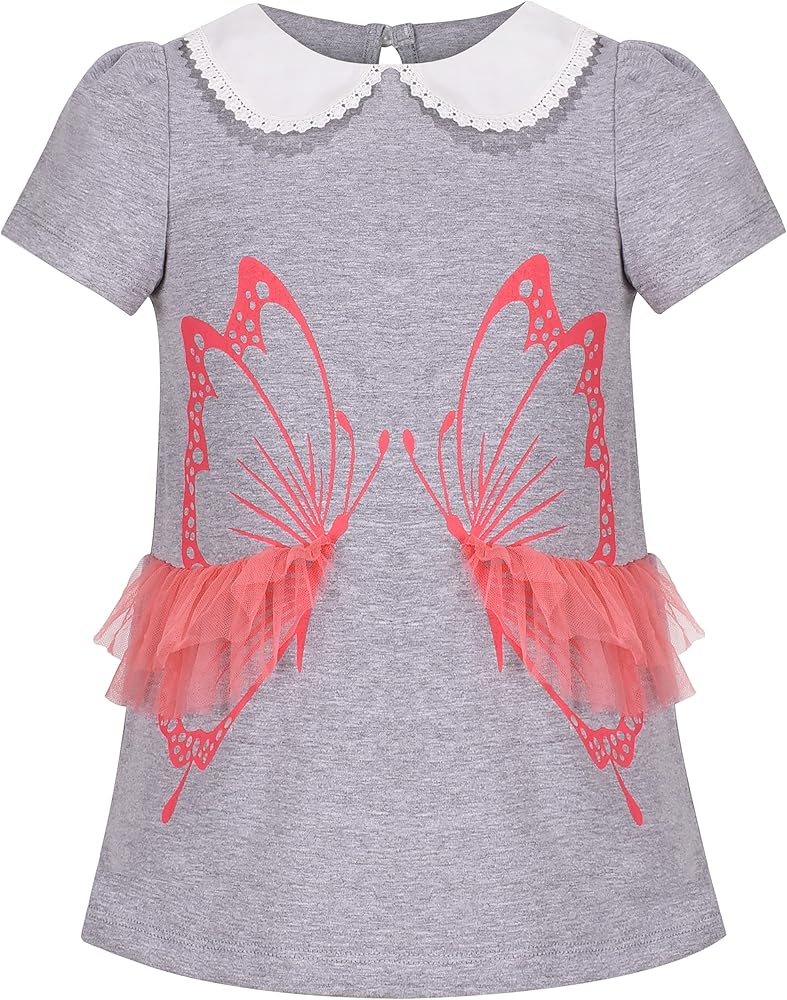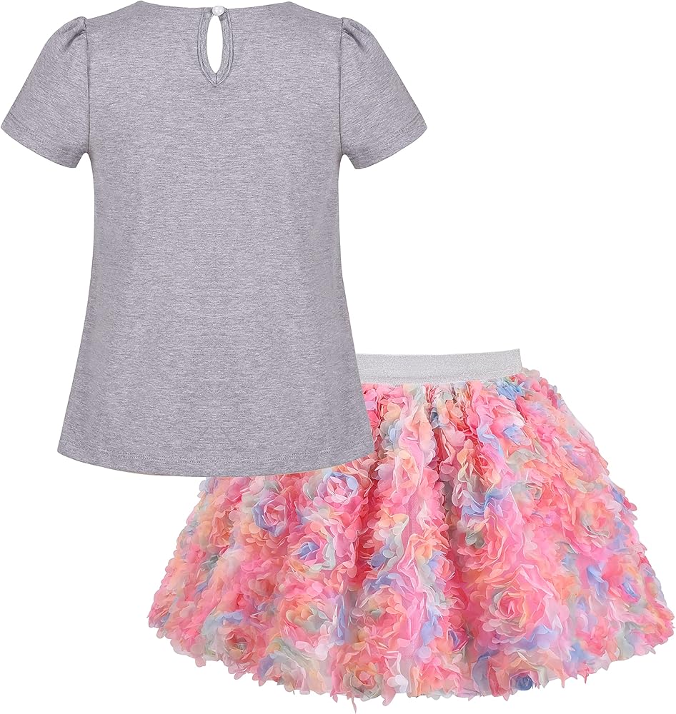 This nice outfit set includes a gray short sleeve shirt with a cute ruffle butterfly and collar, and a flowers blooming skirt with an overlay with floral details. It makes your princess super lovely for everyday and special occasion wearing. Following size means age ranges for girls, they are for general guidance only. For most accurate fit, we recommend checking detailed measurement before purchase.