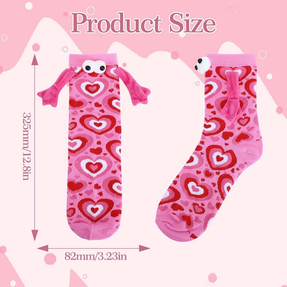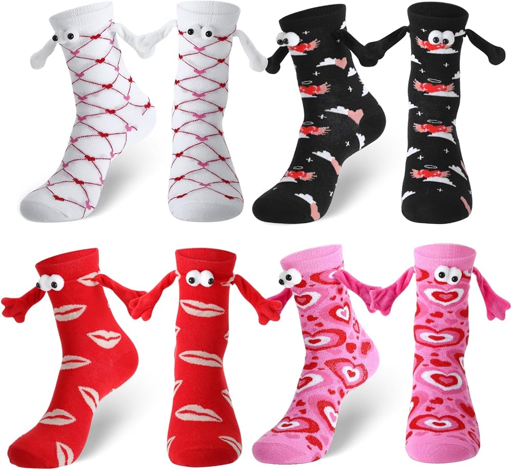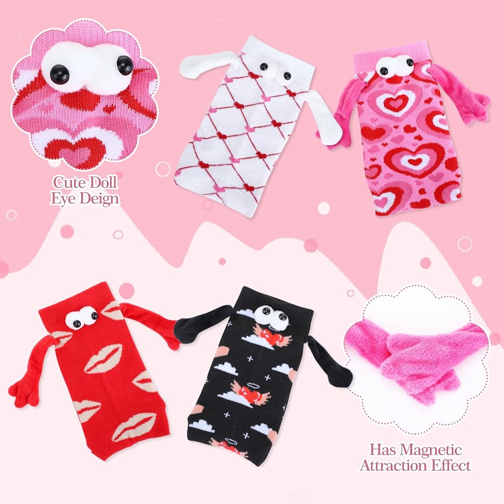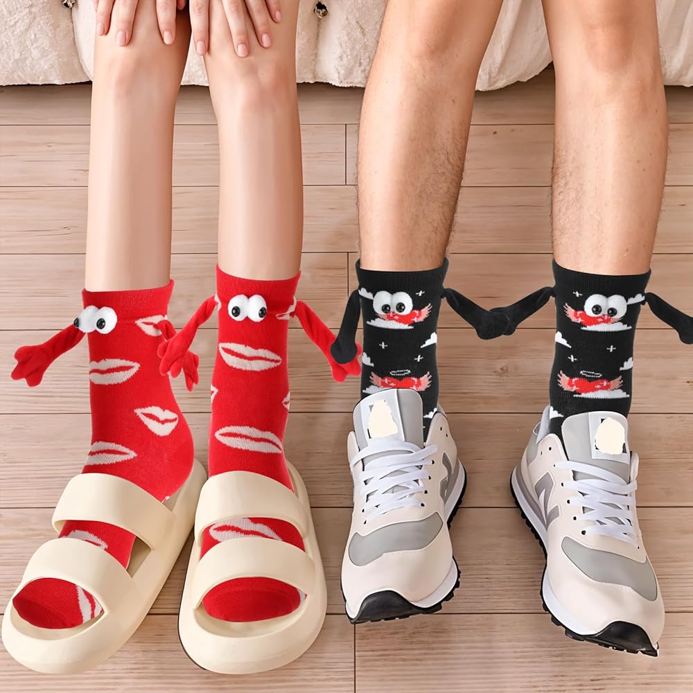 Novelty Gift: These funny friends socks features a unique hand in hand design and cute 3D eye design, printed with heart and lip elements, and is loved by girls. It is perfect as a Christmas gift, New Year's gift, Valentine's Day gift, birthday gift, etc. The magnetic hand holding socks is the perfect gift for family, girlfriend, boyfriend, best friend, or anyone you love.