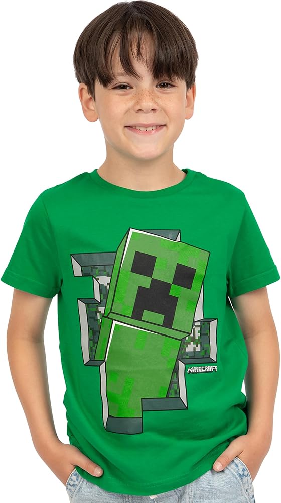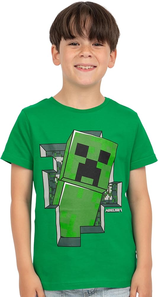 Boys Minecraft T-Shirt. Add something mine-tastic to their wardrobes with this awesome green Minecraft top! Featuring an eye-catching design of a Creeper, this Minecraft Tee is just a great piece any young fan of this popular game will love to have. Made of high quality cotton, this short sleeved top is great to wear over jeans, on any day out or even while they play to become the greatest little miner in all the circles of Minecraft.