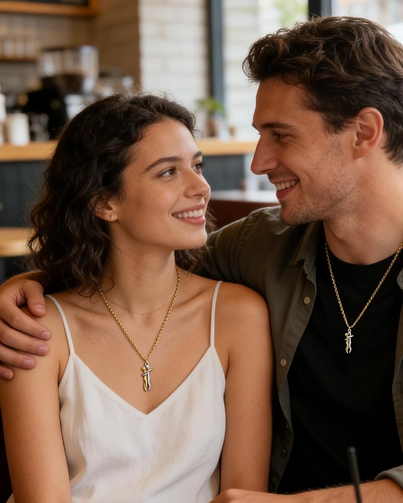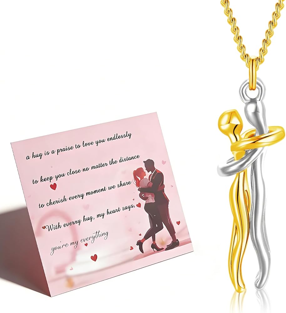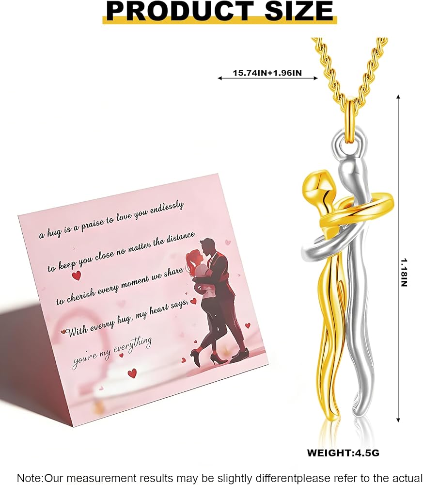 Couple Hugging Necklace:Affectionate Hug Necklace means that two hearts attract each other and miss each other. The design of the two characters hugging together symbolizes passion and beautiful love. The design is novel and unique, which makes you exude elegant charm.