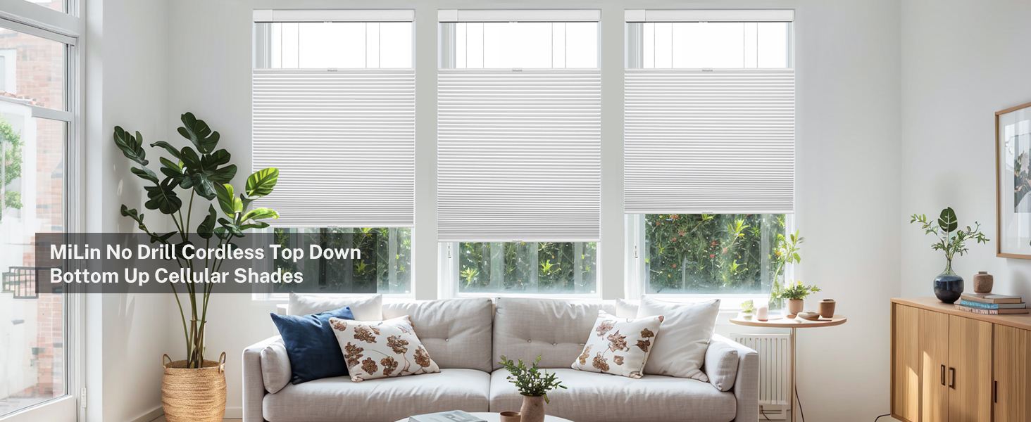 【غطاء متناسق الألوان】تأتي ستائر MiLin بدون حفر للنافذة مع غطاء متناسق الألوان، ويكمل نسيج الستائر الخلوية، مما يخلق تأثيرًا بصريًا متناغمًا ومتطورًا، مما يعزز المظهر العام للظلال.