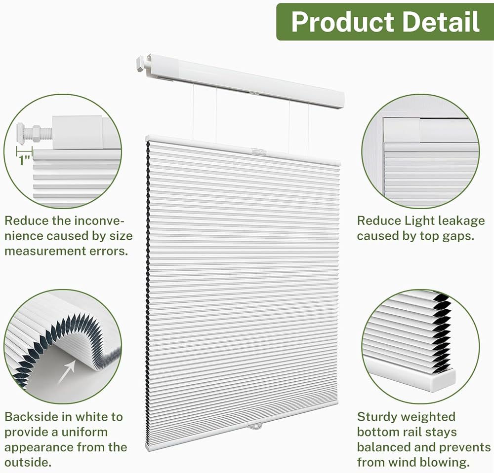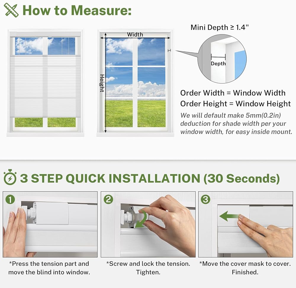 【خصم بوصة】 سيتم تقليل عرض الستائر والظلال الخلوية من MiLin بمقدار 0.2 بوصة لسهولة التركيب الداخلي. عرض النافذة التي طلبتها = عرض النافذة التي قمت بقياسها. على سبيل المثال، إذا كان حجم النافذة التي قمت بقياسها هو 48 بوصة، فإن عرض النافذة التي طلبتها هو 48 بوصة. يمكنك العثور على المزيد من خيارات الحجم في خيارات التخصيص.