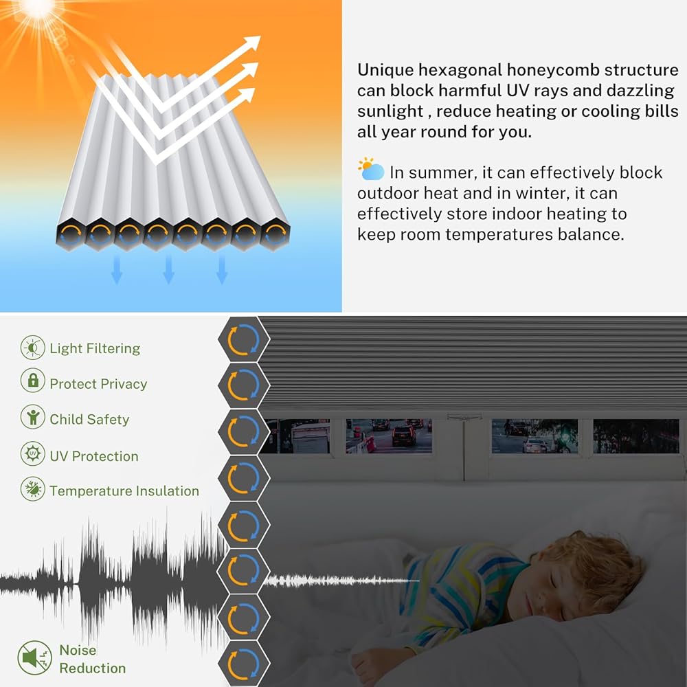 【تأثير تعتيم بنسبة 100%】هذه الظلال الخلوية المعتمة مصنوعة من قماش يحجب الضوء وهو مصمم لمنع أشعة الشمس ومصادر الضوء الخارجية بشكل فعال. كما قمنا بإضافة حاجز على آلية الدوران لمنع أي مشاكل تسرب للضوء في موقع الآلية. توفير قدرات ممتازة لتعتيم الغرفة وتحسين نوعية النوم.