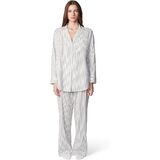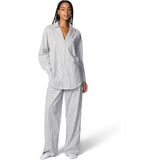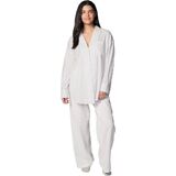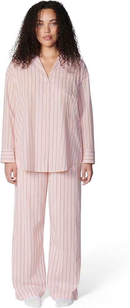 Oversized long-sleeve button-down sleep shirt in Soft Millie Lavender Stripe with front patch pocket and baby button detail at closure.