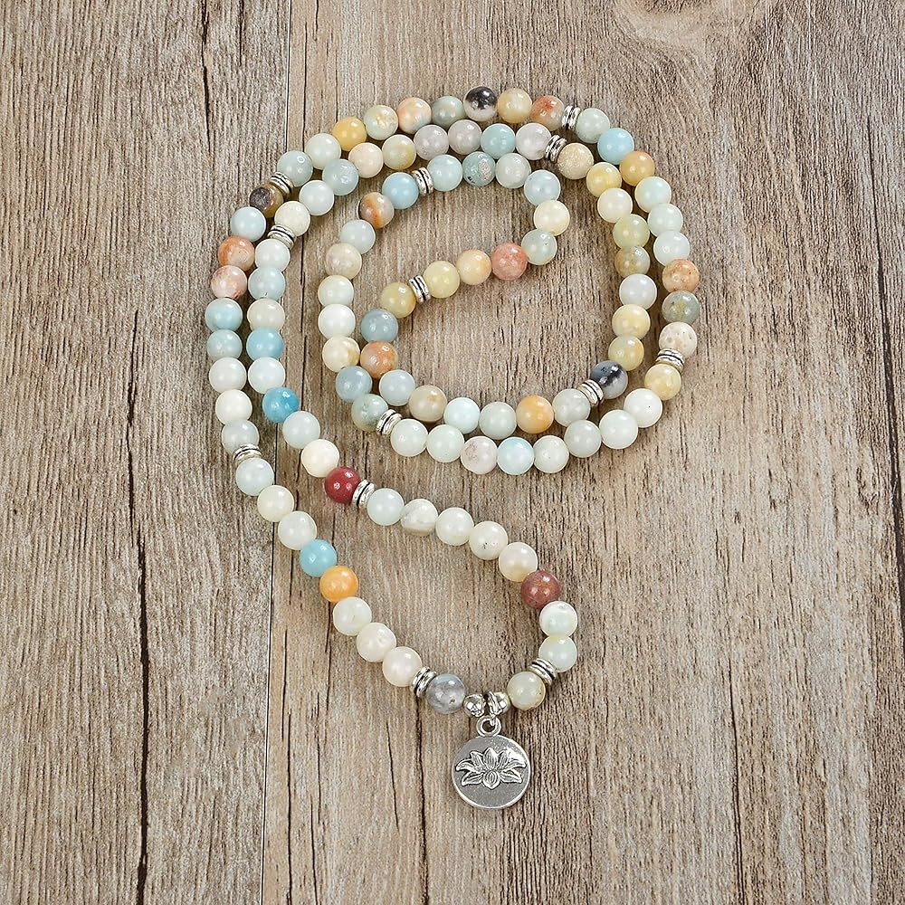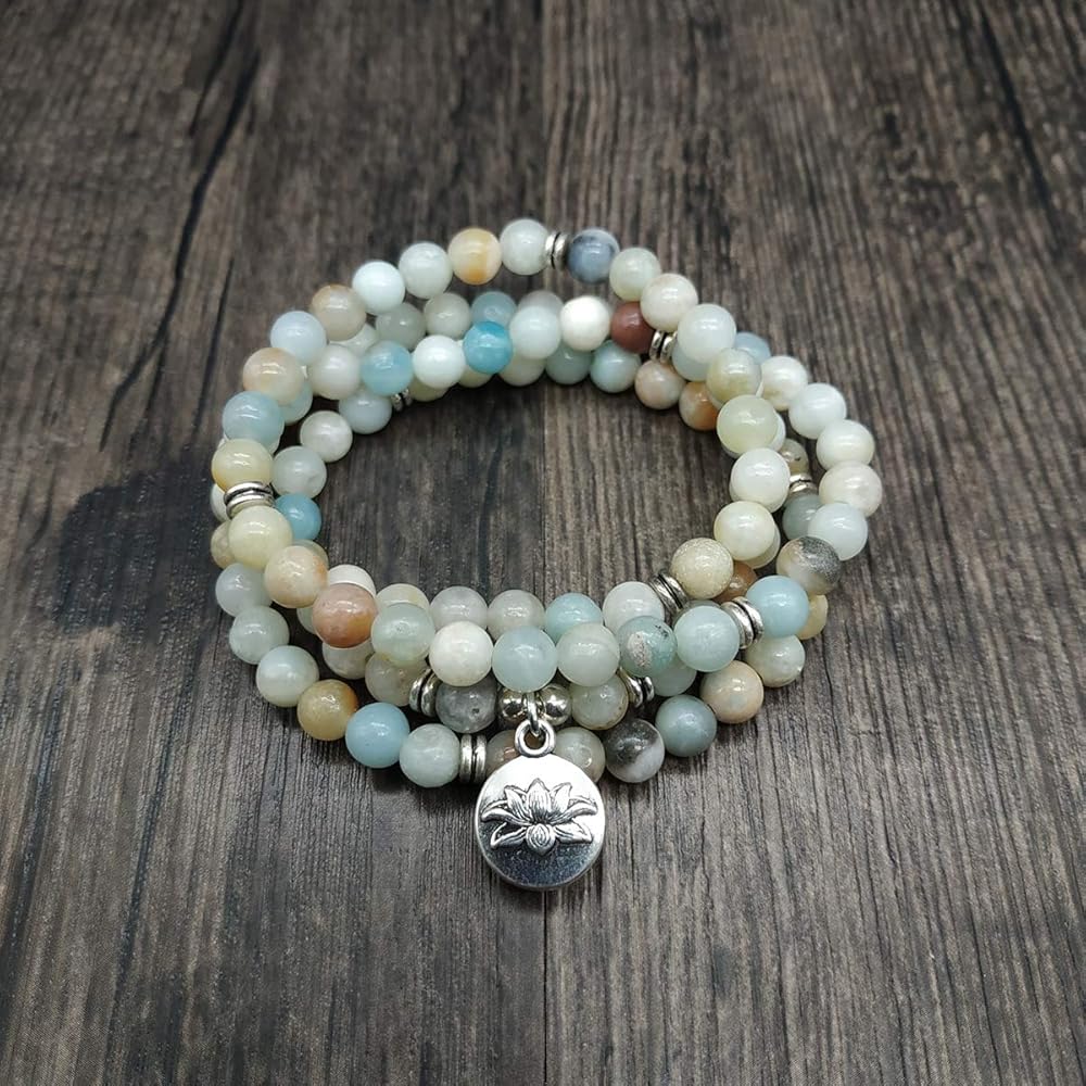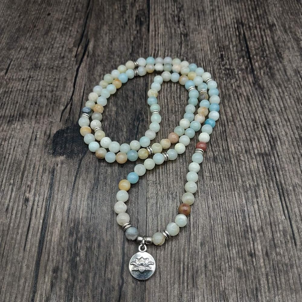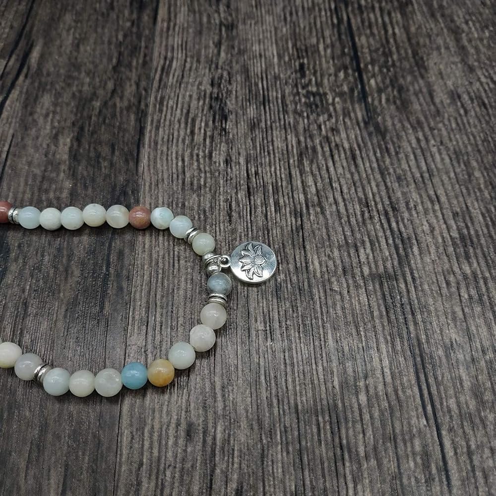سوار مالا 108 خرزة مع حلية اللوتس وخرز حجري صغير 6 ملم (أمازونيت)