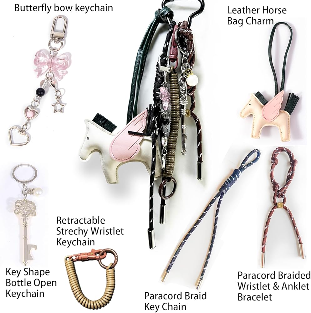 زينة الحقيبة تتكون من مجموعة متنوعة من سلاسل المفاتيح: تشتمل إكسسوارات الحقائب هذه على سلسلة مفاتيح باراكورد جديلة، وسوار معصم من سلسلة مفاتيح حبل قابلة للسحب، وسلسلة مفاتيح ملفوفة حلزونية قابلة للتمدد، وسلسلة مفاتيح هاتف على شكل فراشة وردية، وسلاسل مفاتيح من الجلد على شكل حصان، وسلسلة مفاتيح عتيقة من سبيكة معدنية . يمكن فصل كل قلادة واستخدامها لتزيين مفتاح السيارة والمنزل وحقيبة الظهر وحقيبة اليد والمحفظة والهاتف والكاميرا بشكل منفصل أيضًا.