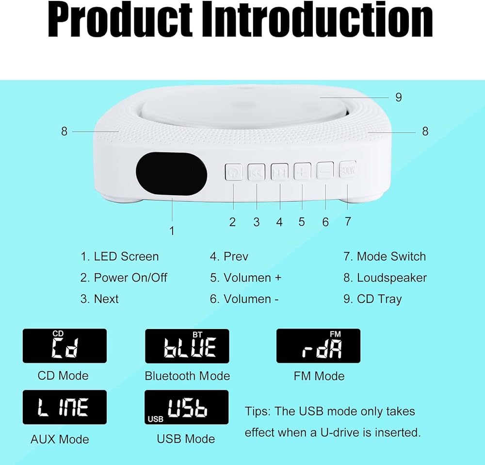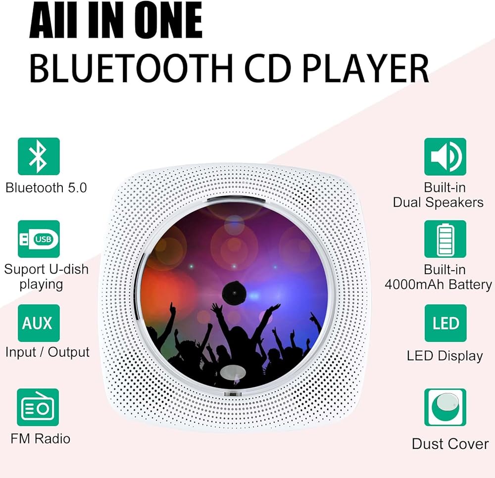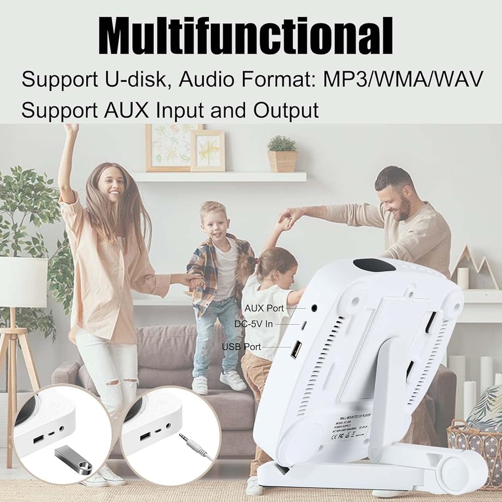 🎼[تصميم سطح المكتب والقابل للتعليق] تشغيل الموسيقى الخاصة بك باستخدام مكبرات الصوت، مما يوفر جودة صوت واضحة تمامًا. مع مجموعة التثبيت على الحائط واللوحة، يمكنك تعليقها على الحائط. أو مع الحامل القابل للتعديل، يمكنك أيضًا وضعه على مكتبك أو وضعه بشكل مسطح على مكتبك. الصيغ المدعومة: CD، CD-R، CD-RW، MP3، WMA، WAV.