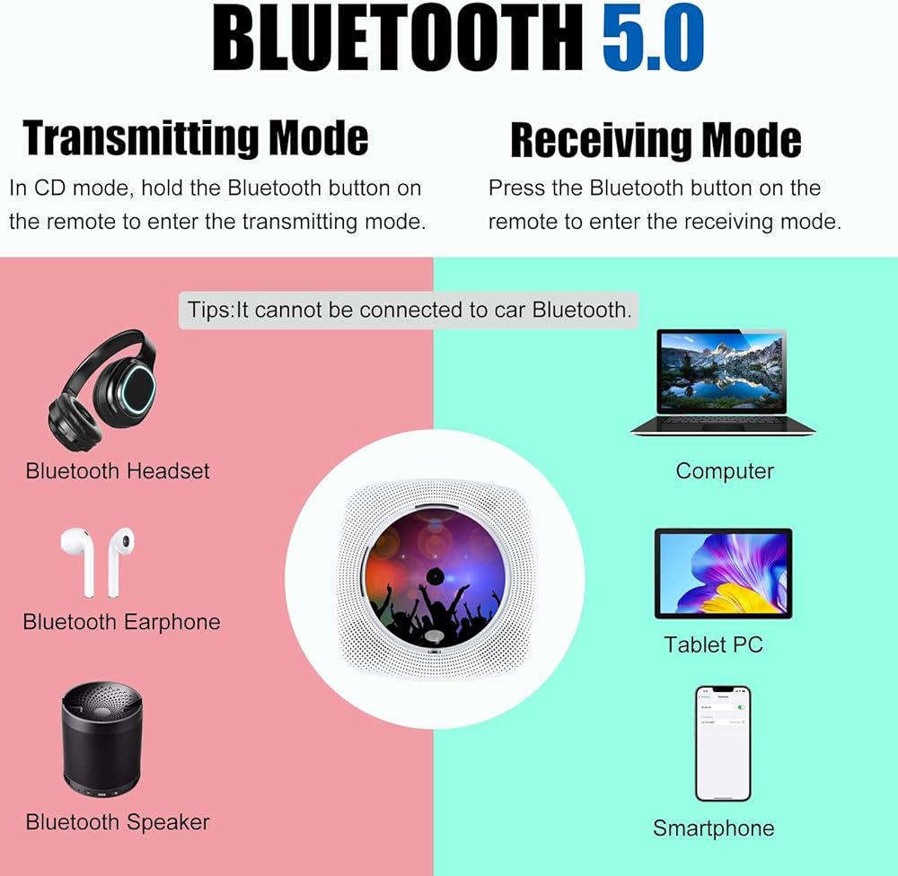 🎼[مشغل أقراص مضغوطة بلوتوث] استمتع بصوت لاسلكي عالي الجودة مع مكبرات صوت بلوتوث HIFI مدمجة وأحدث إصدار من البلوتوث. استخدمه كمكبر صوت من خلال الاتصال بأجهزة Bluetooth الخاصة بك، مثل الهواتف الذكية أو الكمبيوتر اللوحي. استخدمه أيضًا كجهاز إرسال بلوتوث، يمكنك توصيله بسماعات الرأس التي تعمل بتقنية البلوتوث. (ملاحظة: إنه جهاز إرسال واستقبال بلوتوث.)