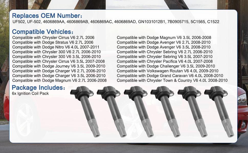 [متوافق مع] متوافق مع 2006-2010 كرايسلر 300 V6 2.7L، متوافق مع 2006-2010 كرايسلر 300 V6 3.5L، متوافق مع 2006 كرايسلر سيروس 2.7L V6، متوافق مع 2007-2008 كرايسلر سيروس 3.5L V6، متوافق مع 2006-2010 كرايسلر سيبرينج V6 2.7L، متوافق مع 2007-2010 كرايسلر سيبرينج V6 3.5L، متوافق مع 2008-2010 كرايسلر تاون آند كانتري V6 4.0L، متوافق مع 2007-2008 كرايسلر باسيفيكا V6 4.0L.