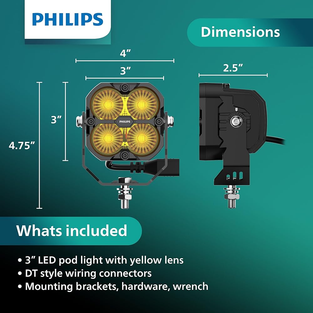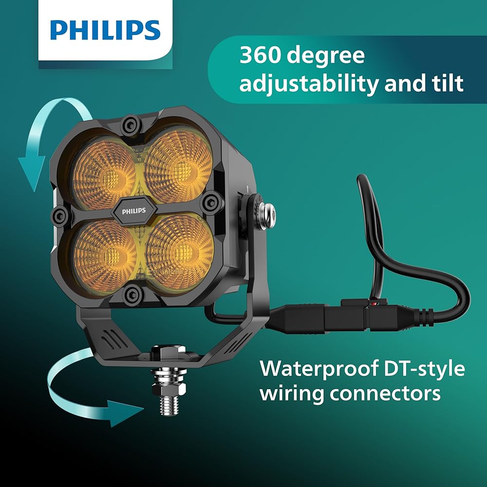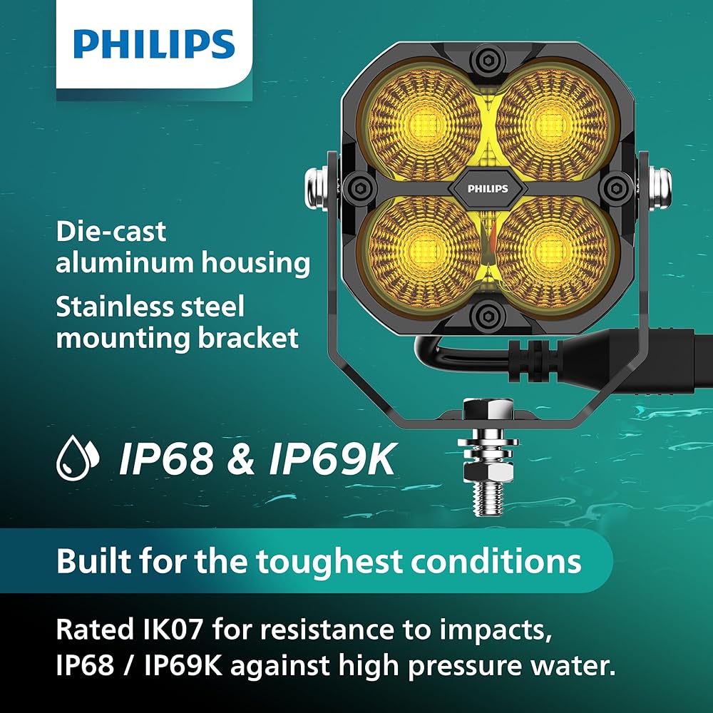 For motorists who frequently drive in hazardous conditions, we offer Philips Ultinon Drive 5000 series selective yellow LED lightbars and pod lights. These lightbars and pod lights can provide a better option for penetrating through snow, fog, rain or other low visibility conditions. Brilliant LED lighting for thrilling off-road adventures. For drivers who demand the maximum of themselves and their machines. Exceptionally rugged, with unsurpassed illumination and beam focus, these lights will help lead the way wherever you want to go. Built for Tough Environments, Philips Ultinon Drive 5000 series yellow LED lightbars and pod lights are built to withstand the toughest conditions. Combined with excellent heat management, the designs provide consistent high light output throughout your journey. They also have an impact protection rating of IK07, to ensure it can withstand the hazards of aggressive off-roading. Rugged polycarbonate lenses resist damage and scratches. Thick stainless steel brackets and hardware are corrosion resistant and able to withstand heavy vibrations. Robust DT Connectors provide a plug and play waterproof electrical connection. They are all waterproof rated IP68 and IP69K. This means they are resistant to the ingress of fine dust particles as well as high temperature and high pressure water blasts. These lights will perform, wherever your road leads and whatever the weather. They will be more than a match for any power washer you use to clean your ride after your adventures. Compatible with: POWERSPORTS AND OFF ROAD ENTHUSIAST VEHICLES: Trucks, SUVs, ATVs, UTVs, Side by Sides, 4x4s, Dirt Bikes, Snowmobile, Boats, RVs WORK EQUIPMENT: Tractor, Excavators, Tow Trucks, Snow Plows, Heavy Duty Trucks, Construction, Landscaping