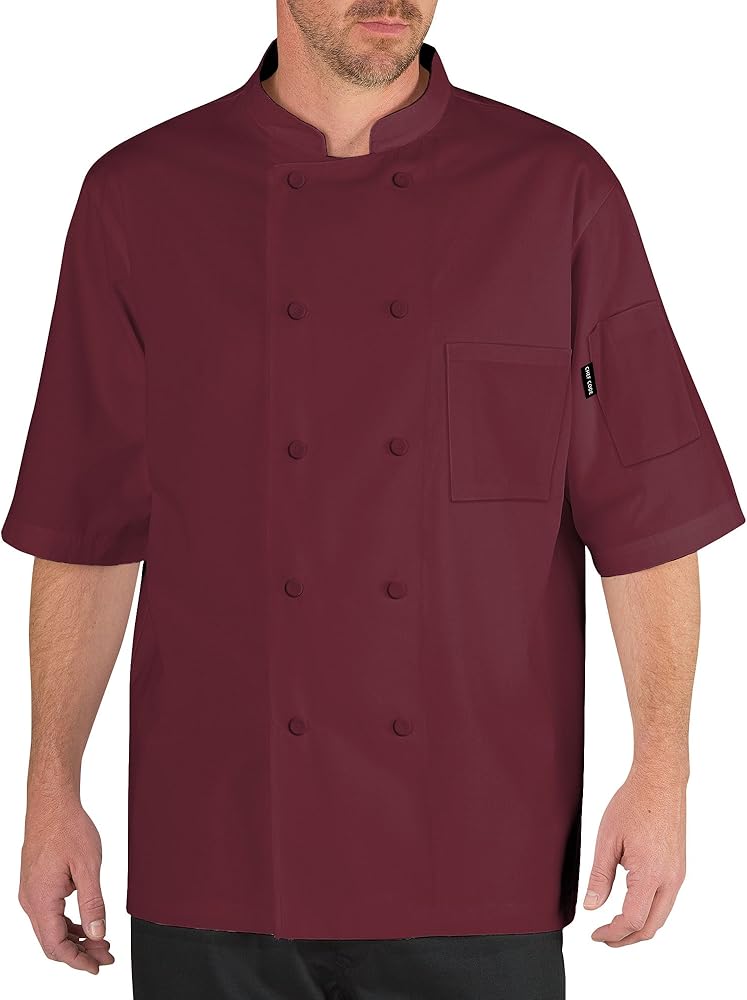 Short sleeve chef coat featuring a mesh, upper back panel to keep things cool and ventilated in the kitchen. Double breasted 60/40 poly-cotton made with fabric-covered buttons, French cuffs, thermometer and left inset pockets.