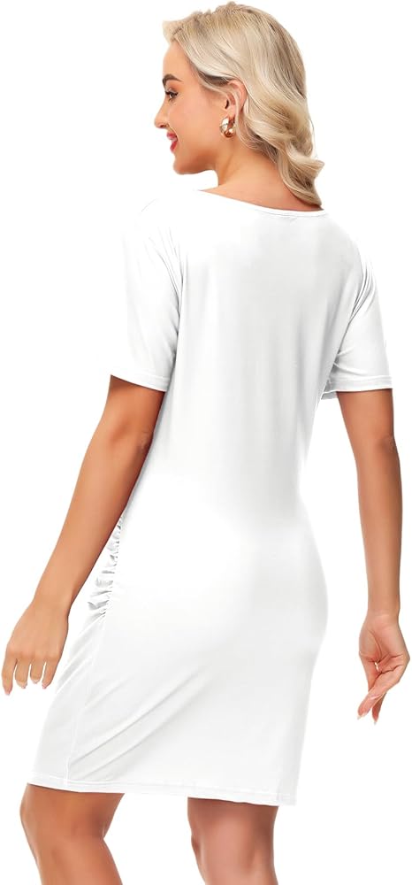 Design: Round Neckline, Short Sleeves, Graphic Printed, Side Ruched, Bodycon, Mini Length.