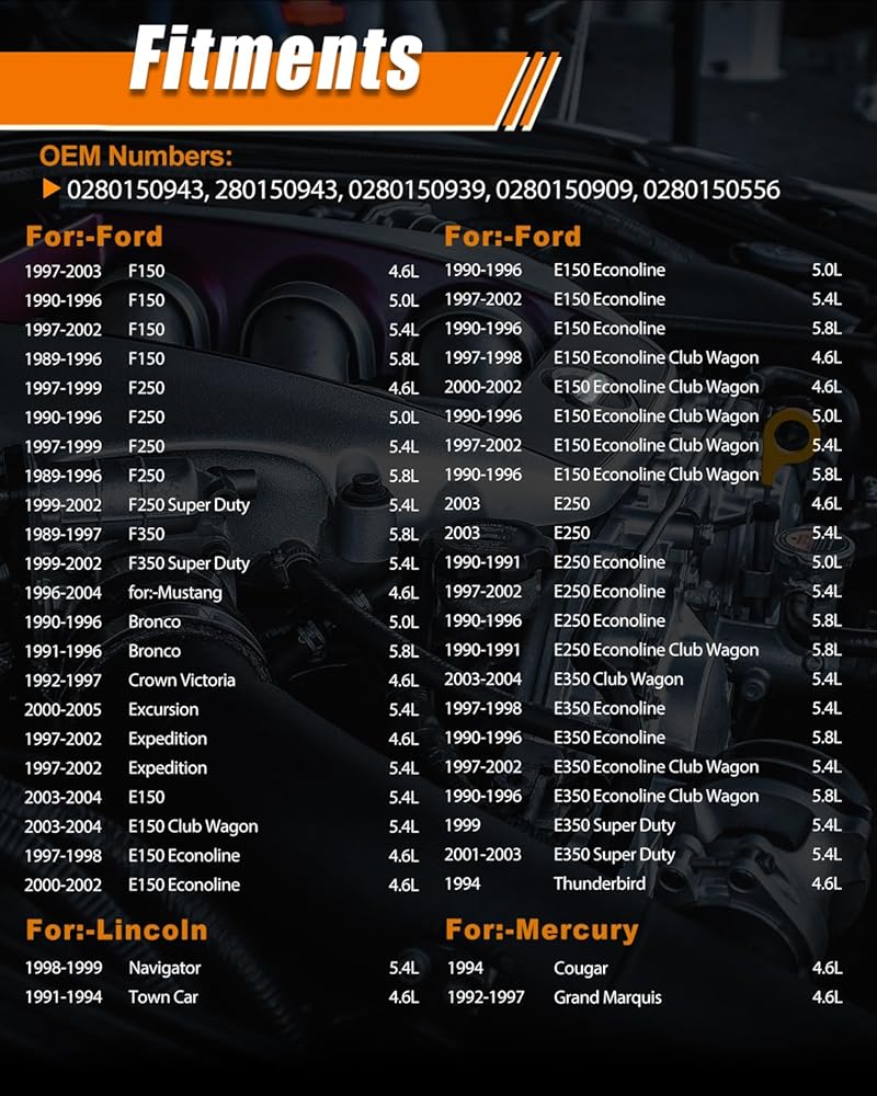 • تطبيق ل:-فورد: 1997-2003 F150 4.6L / 1990-1996 F150 5.0L / 1997-2002 F150 5.4L / 1989-1996 F150 5.8L / 1997-1999 F250 4.6L / 1990-1996 F250 5.0L / 1997-1999 F250 5.4L / 1989-1996 F250 5.8L / 1999-2002 F250 سوبر ديوتي 5.4L / 1989-1997 F350 5.8L / 1999-2002 F350 سوبر ديوتي 5.4L / 1996-2004 لـ:-موستانج 4.6L / 1990-1996 برونكو 5.0L / 1991-1996 برونكو 5.8L / 1992-1997 كراون فيكتوريا 4.6L / 2000-2005 رحلة 5.4L