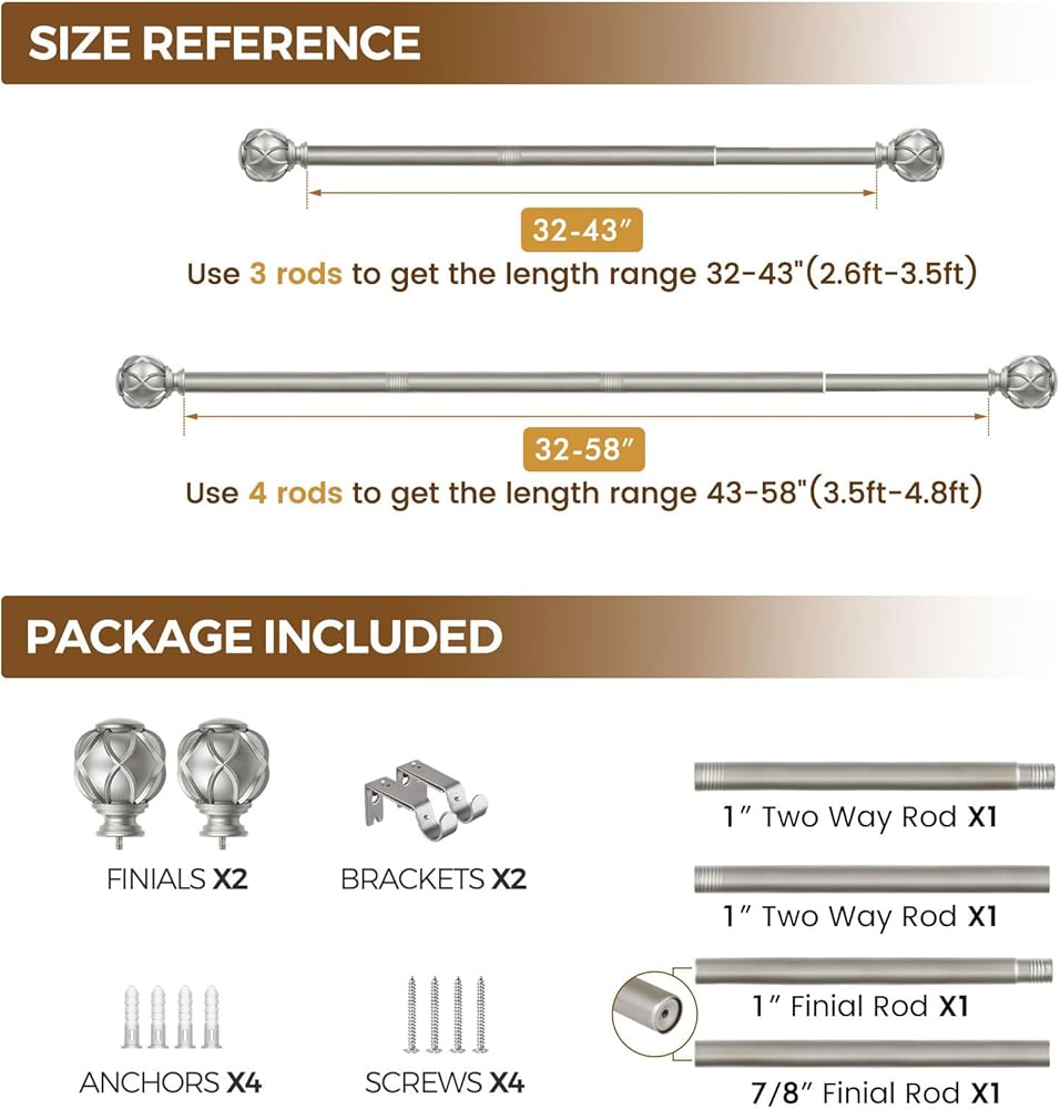 هيكل الربط والتلسكوب: يمكن أن يمتد قضيب ستارة KAMANINA القابل للتعديل بسهولة من 32 إلى 58 بوصة، وينطبق على النوافذ من 20 إلى 54 بوصة. مثالي لمطبخك، وغرفة الطعام، وغرفة النوم، وغرفة الأطفال، وغرفة المعيشة، والمكتب، وما إلى ذلك. إذا كان لديك أي قلق بشأن المقاس قبل الشراء، فيرجى الاتصال بنا.