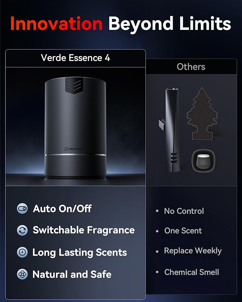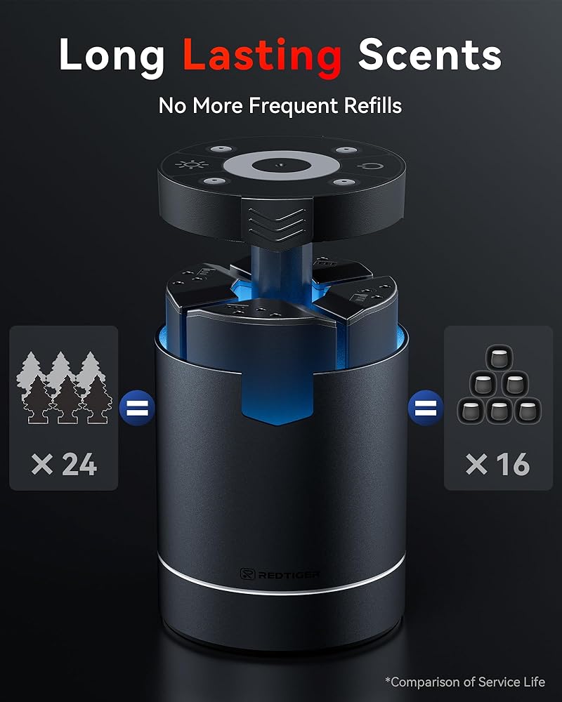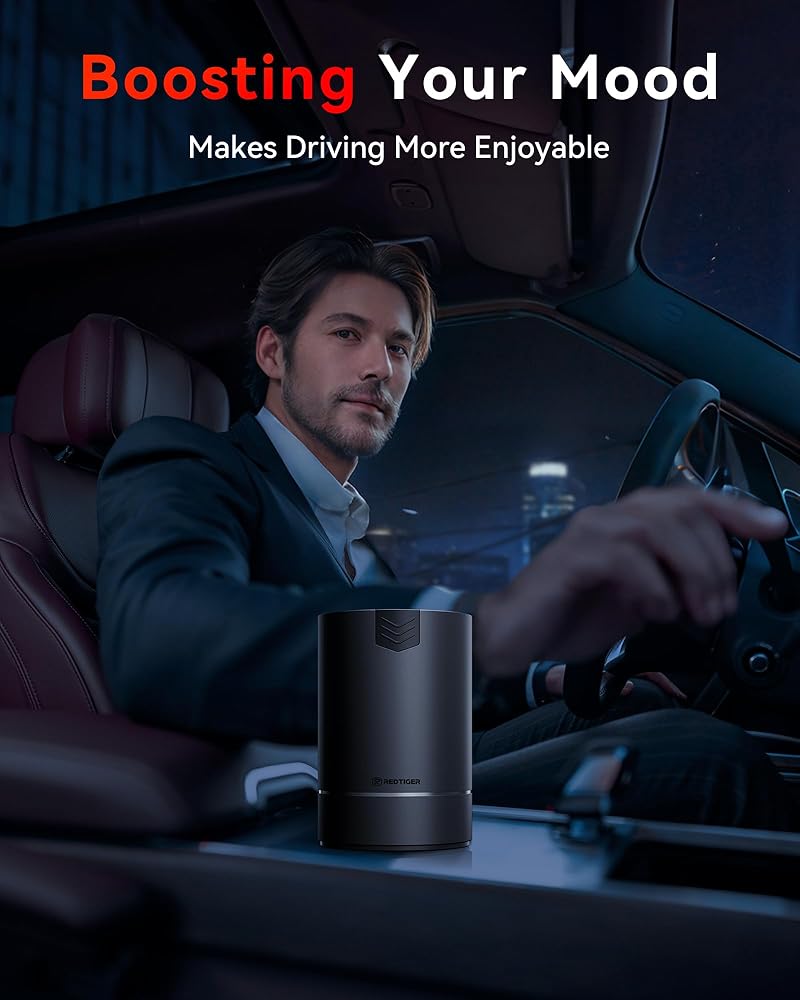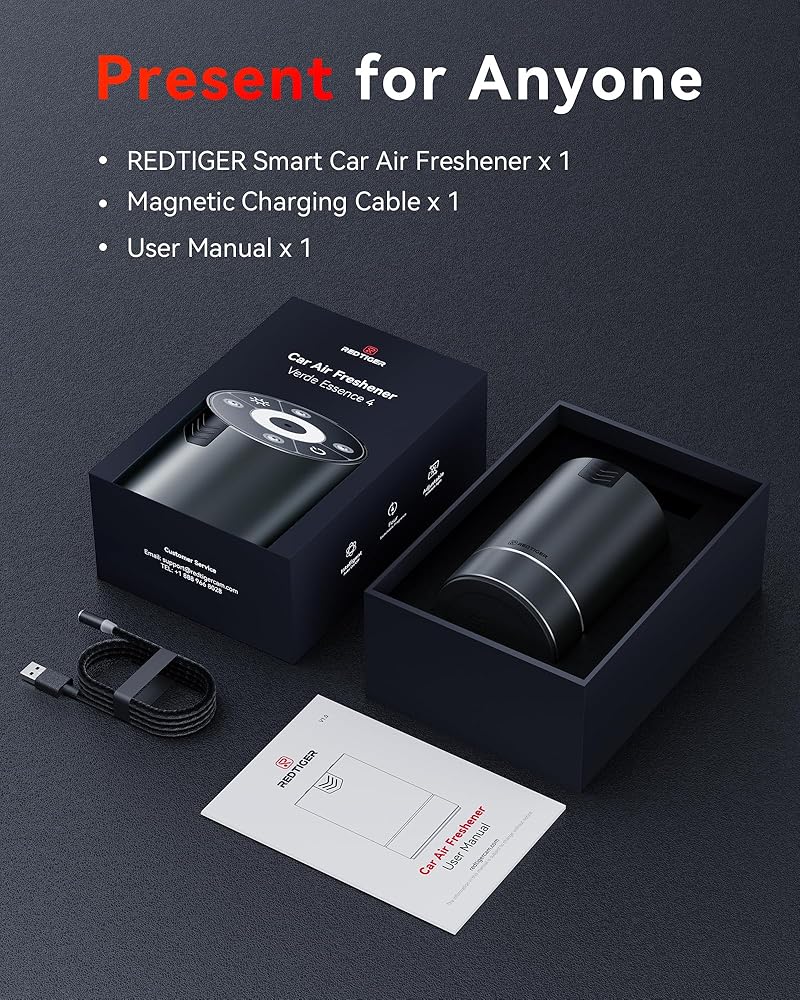 • 4 عطور قابلة للتبديل: ارفع تجربة القيادة الخاصة بك مع معطر هواء السيارة الذكي REDTIGER. اختر عطرك - خشب الأرز، واللافندر، والزهور، والقهوة - ليناسب حالتك المزاجية. استمتع برحلة معطرة منعشة مع عائلتك وأحبائك