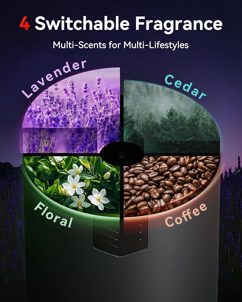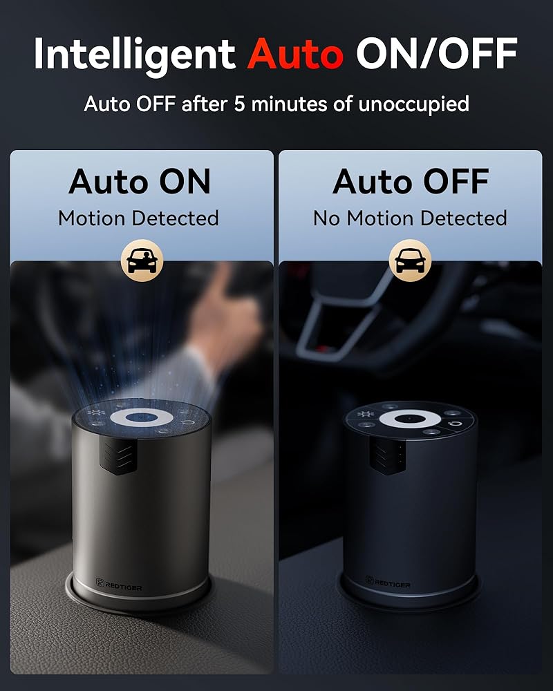 • تشغيل/إيقاف تلقائي ذكي: تم تجهيز موزع معطر هواء السيارة الذكي هذا بمستشعر اهتزاز ذكي. يتم تشغيله تلقائيًا عند تشغيل سيارتك وإيقاف تشغيله عند المغادرة. لا داعي لتذكر تشغيله أو إيقاف تشغيله، مما يوفر الطاقة بكفاءة